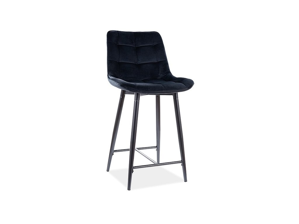 Atraktivní čalouněná polo barová židle. Kovová konstrukce je lakovaná černou barvou, čalounění je z látky Bluvel aksamit v černé barvě. Celková výška židle je 92 cm, výška sedáku je 60 cm. Dodáváme v demontovaném stavu.Doplňkové parametry