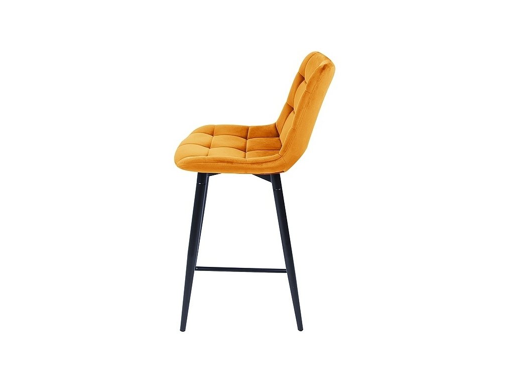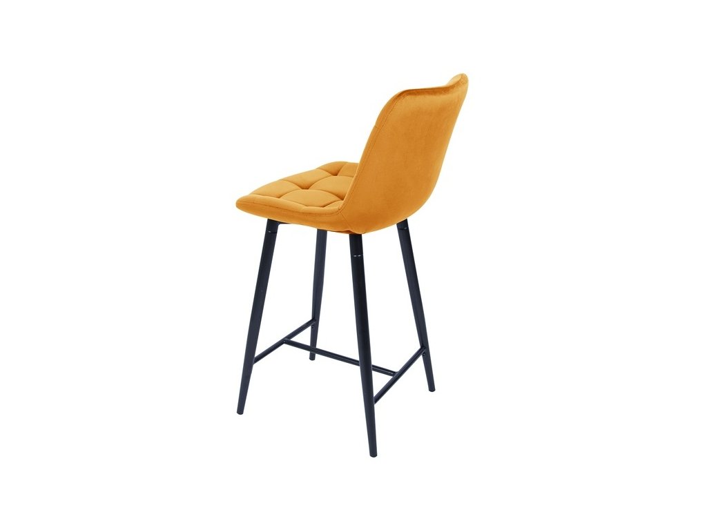 Atraktivní čalouněná polo barová židle. Kovová konstrukce je lakovaná černou barvou, čalounění je z látky Bluvel aksamit ve žluté curry barvě. Celková výška židle je 92 cm, výška sedáku je 60 cm. Dodáváme v demontovaném stavu.Doplňkové parametry