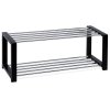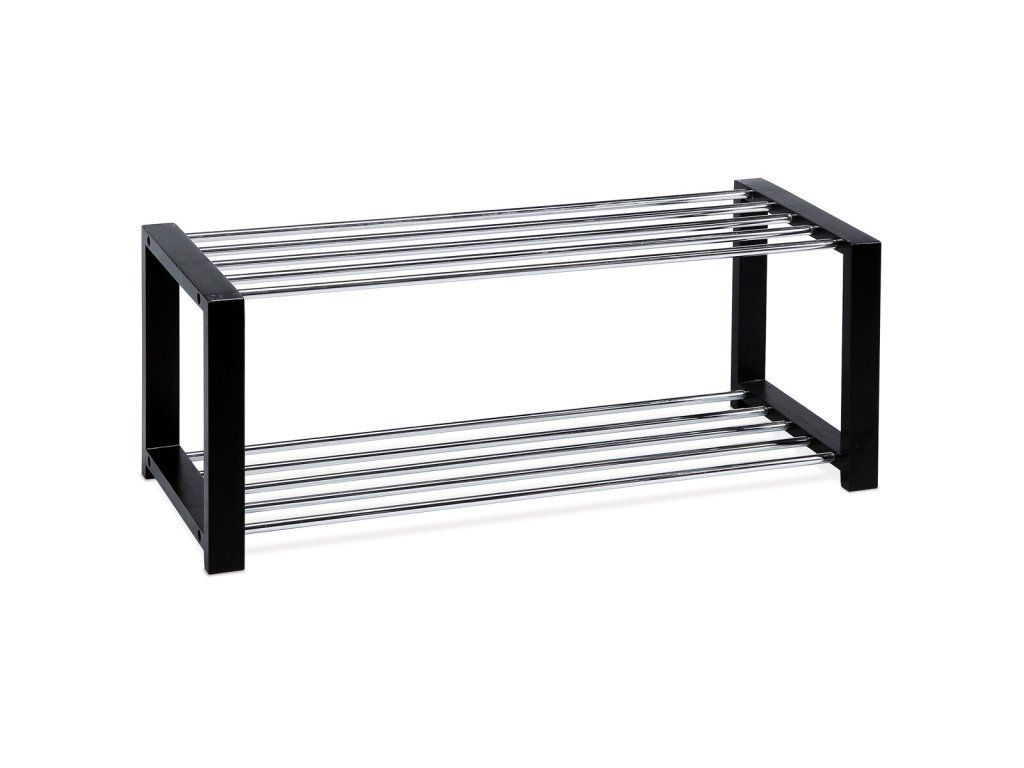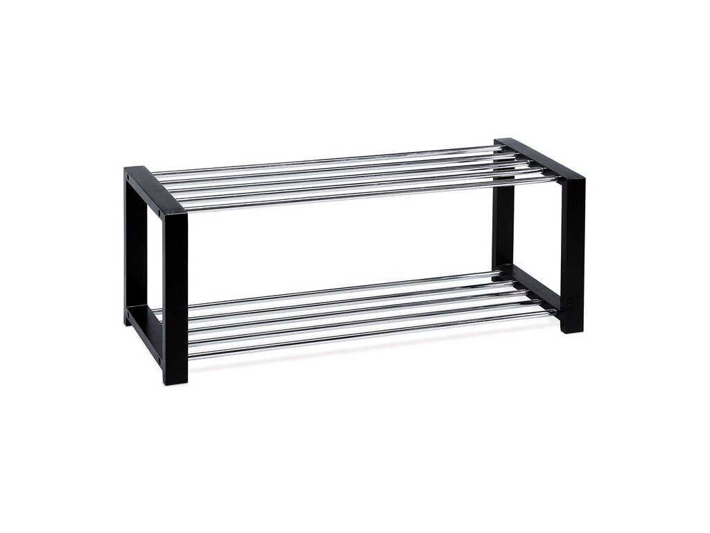 Botník s dvěma chromovanými kovovými policemi a masivními bočnicemi z kaučukovníku v černém matném laku nabízí pevné a stabilní řešení pro uskladnění obuvi. Chromované police jsou odolné vůči opotřebení a snadno se udržují, zatímco masivní dřevěné bočnice dodávají botníku robustní vzhled a dlouhou životnost. Jeho otevřená konstrukce umožňuje dobrou cirkulaci vzduchu, což pomáhá udržet obuv svěží. Kompaktní rozměry a minimalistický design zajišťují snadné umístění v předsíních i menších prostorách.