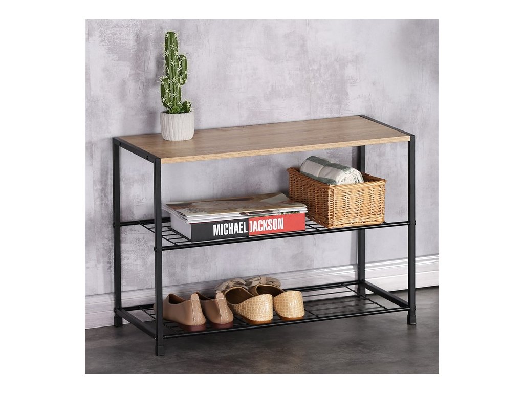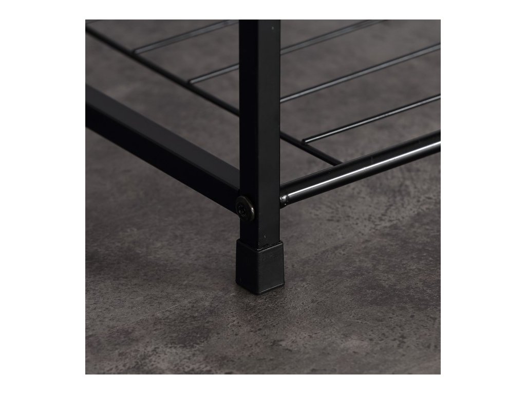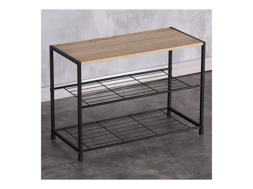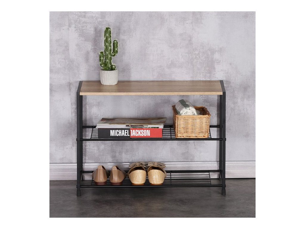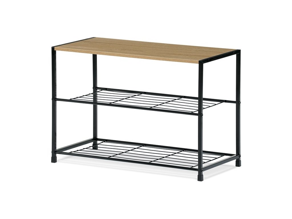 Botník s konstrukcí a odkládacími plochami z lehkého kovu v černé barvě. Půda je vyrobena z MDF desky s povrchovou úpravou 3D folie v odstínu dub sonoma.