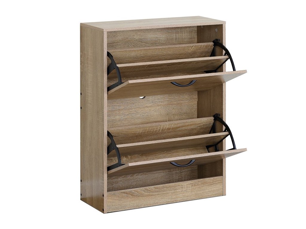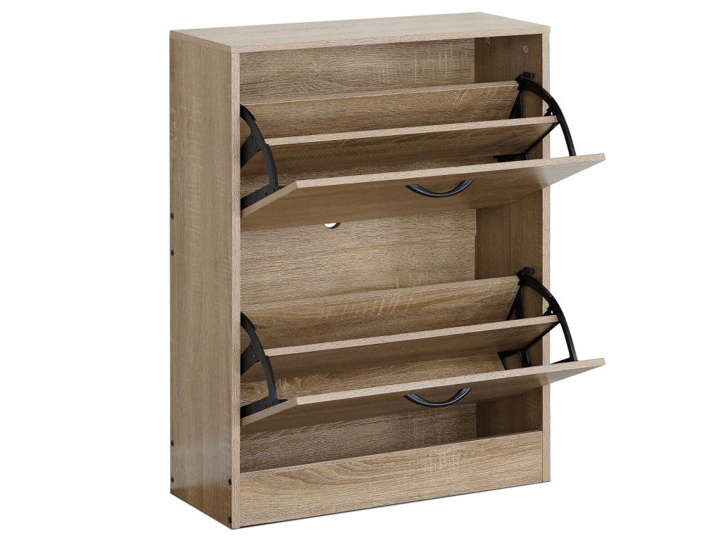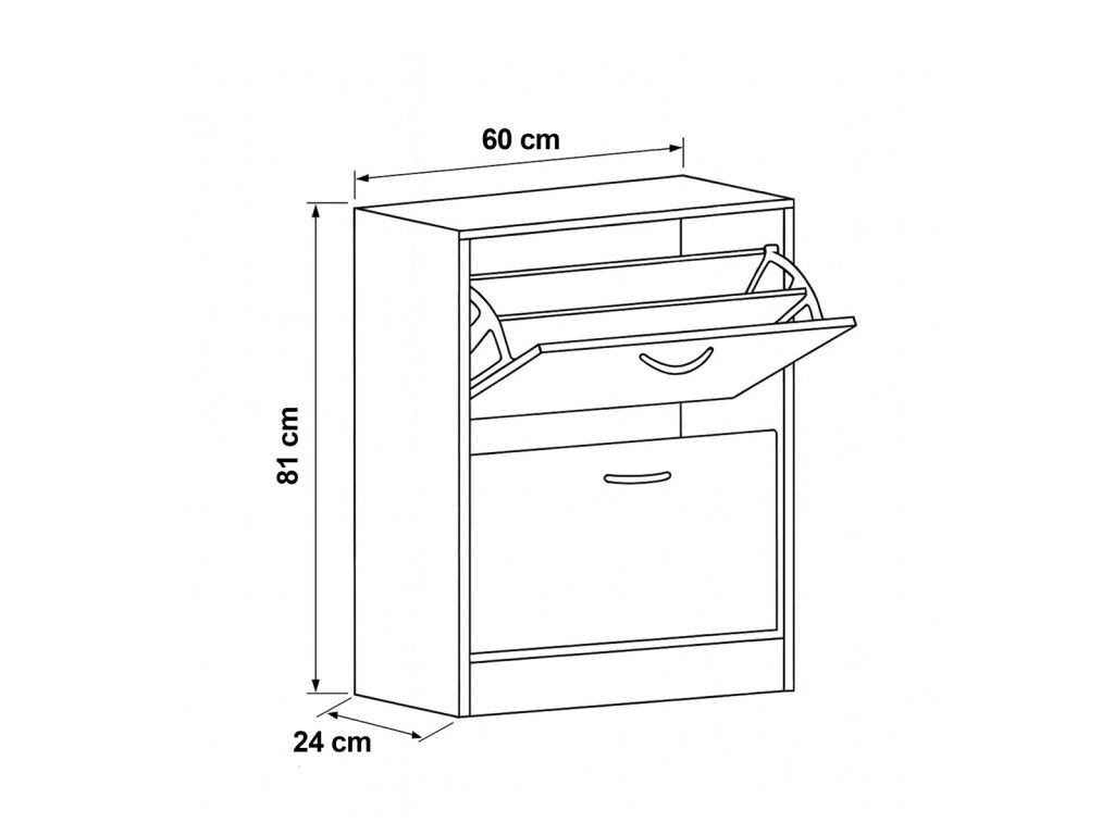 Botník s dvěma přihrádkami v dekoru dub je vyroben z MDF desek s povrchovou úpravou, která napodobuje přirozenou strukturu dřeva. Praktický design umožňuje uložení obuvi do dvou samostatných prostorů s výklopnými dvířky, která jsou opatřena černými kovovými úchytkami pro snadnou manipulaci. Kompaktní rozměry botníku jej předurčují pro umístění v předsíních či menších prostorách, kde oceníte pořádek a rychlý přístup k obuvi. Stabilní provedení a kvalitní materiál zajišťují dlouhou životnost a snadnou údržbu. Botník je vhodný pro uložení několika párů bot, čímž pomáhá udržet vstupní prostor čistý a organizovaný.