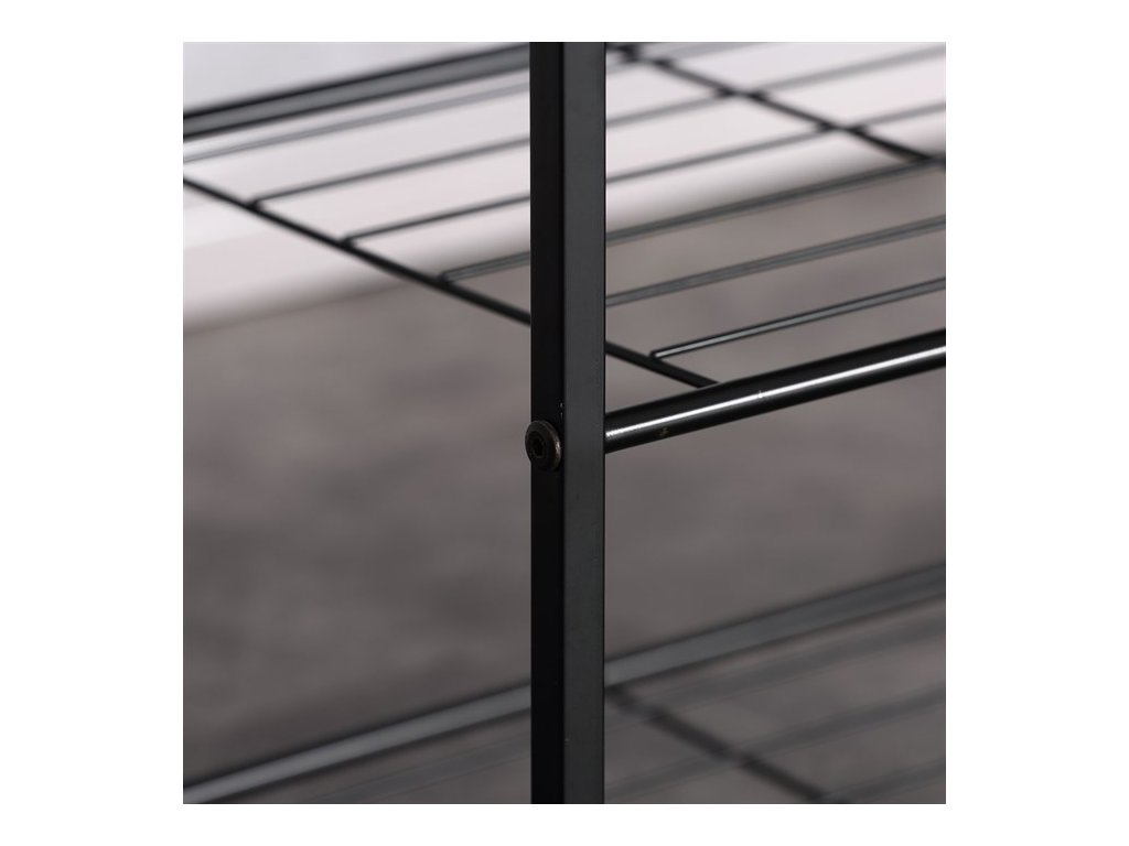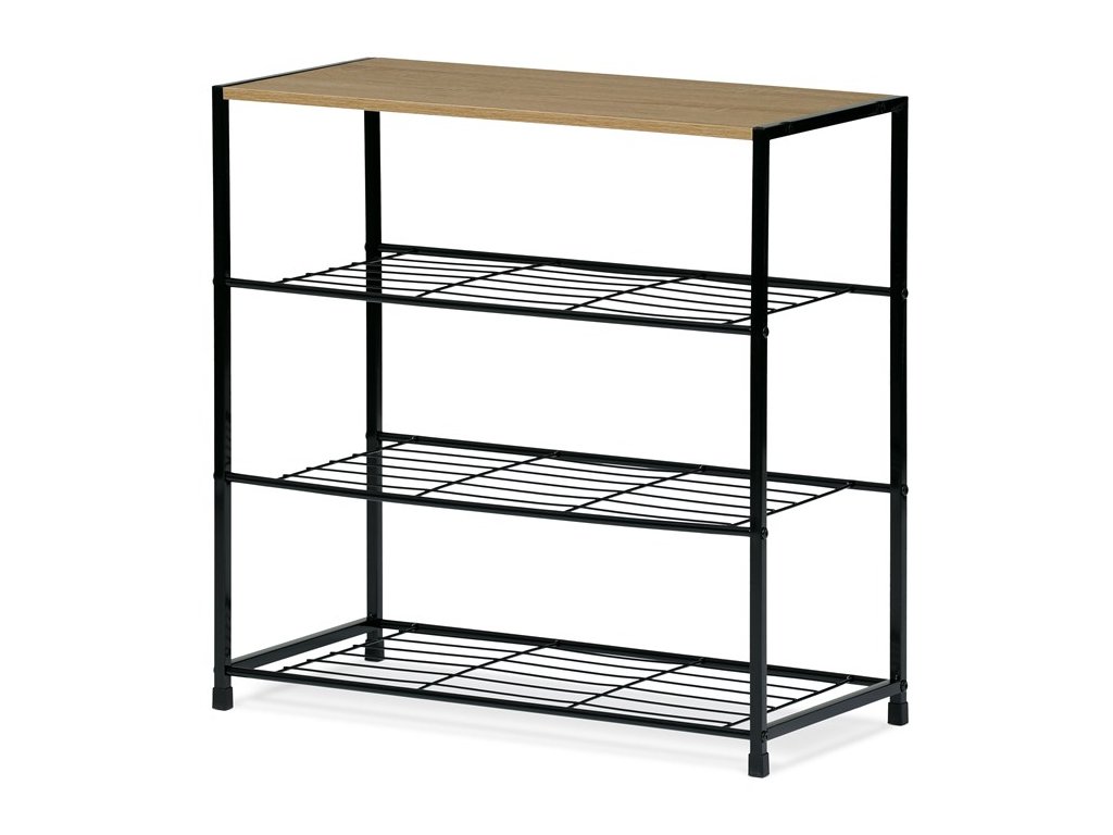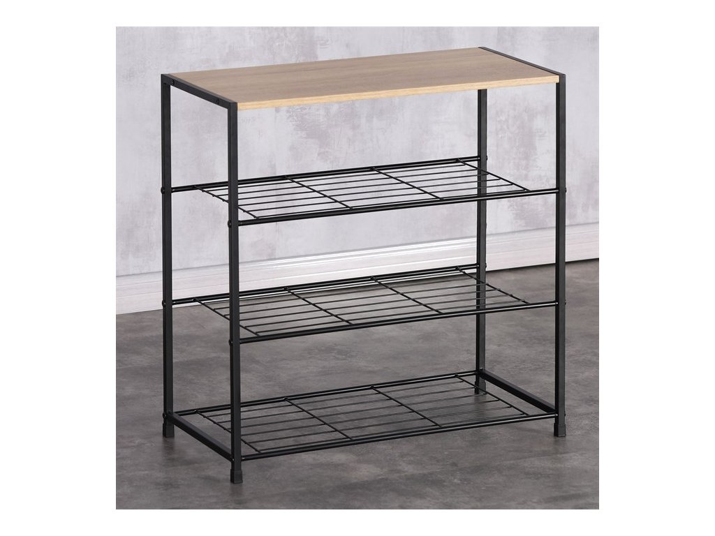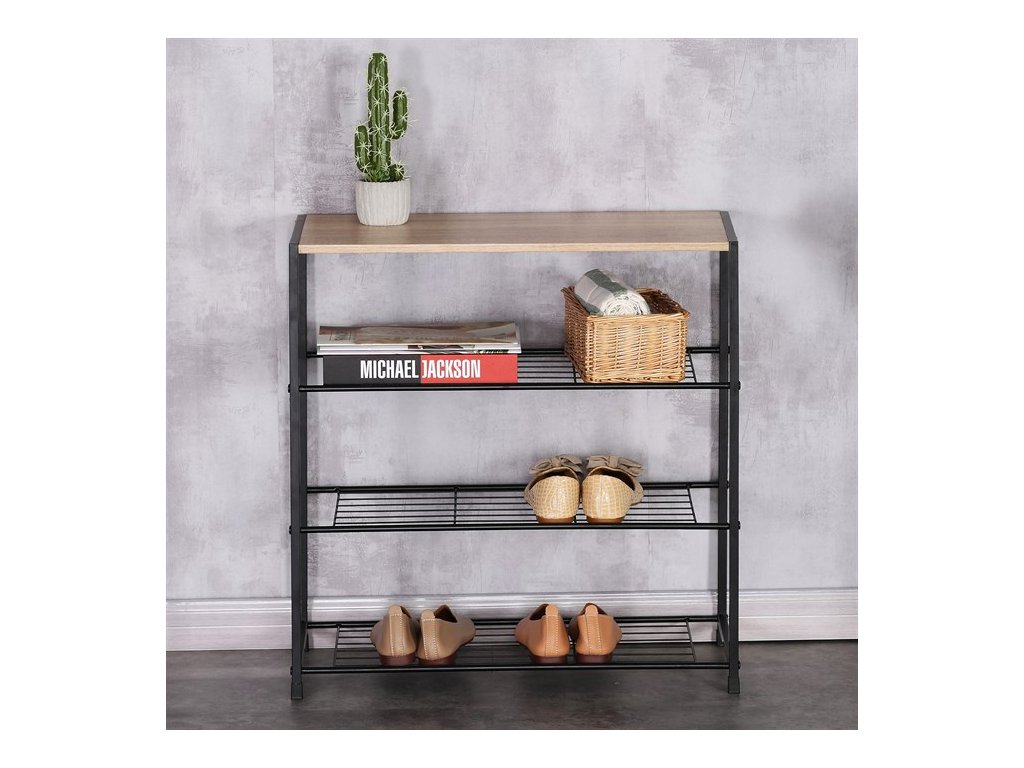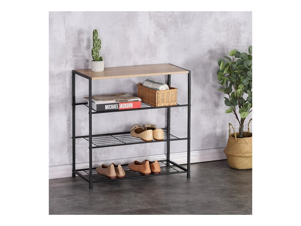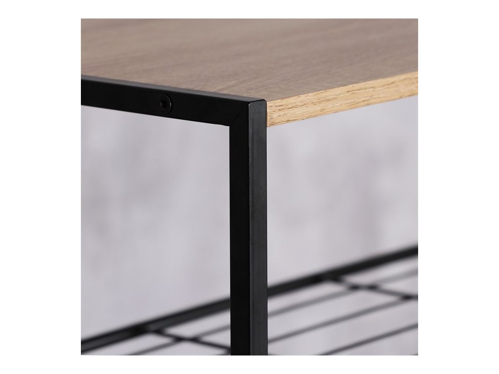 Botník s konstrukcí a odkládacími plochami z lehkého kovu v černé barvě. Půda je vyrobena z MDF desky s povrchovou úpravou 3D folie v odstínu dub sonoma.