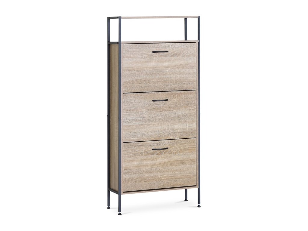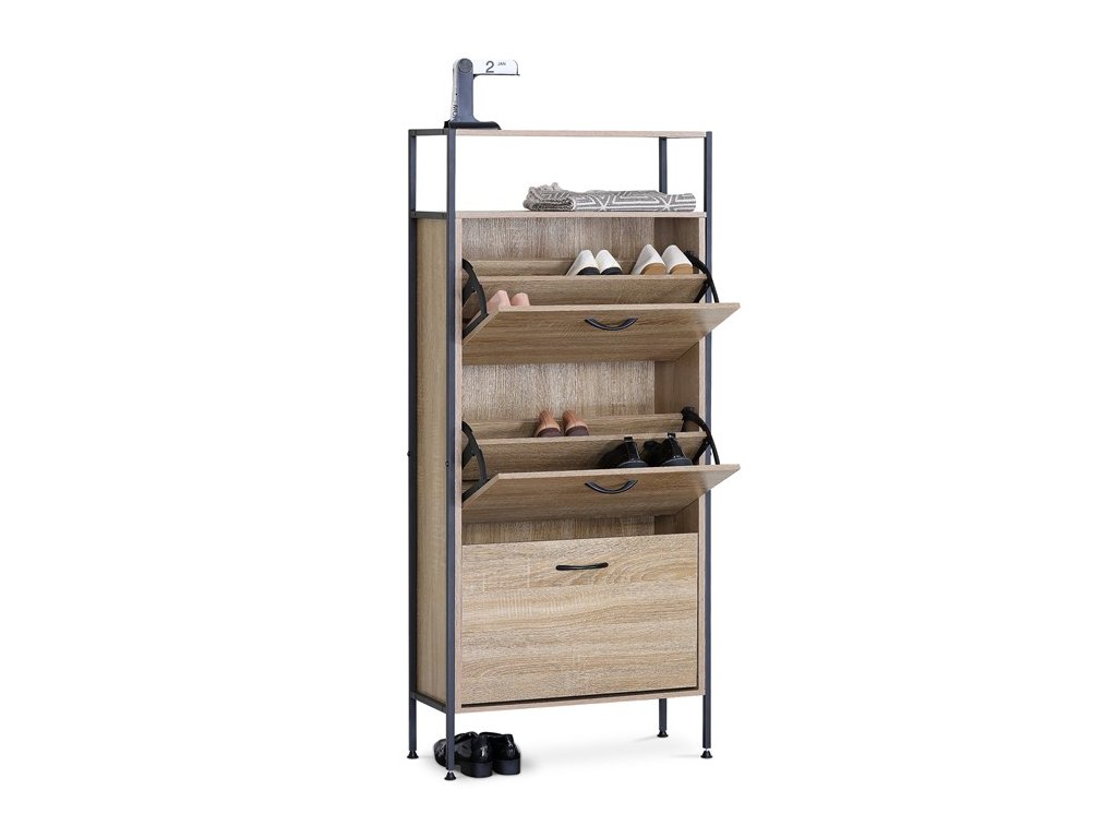 Botník s třemi přihrádkami a dvěma policemi nabízí praktické řešení pro uspořádání obuvi v domácnosti. Desky jsou vyrobeny z MDF v dekoru dub, který přináší přírodní odstíny a decentní strukturu dřeva. Stabilní kovová podnož zajišťuje pevnou oporu a lehkost celkového provedení. Každá přihrádka je opatřena černou úzkou úchytkou pro snadné otevírání a zavírání. Kompaktní rozměry umožňují umístění do předsíně či chodby, kde efektivně využije prostor a udrží pořádek.
