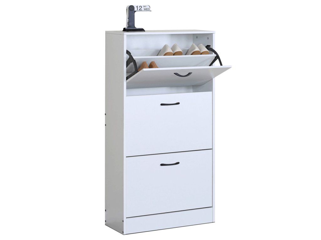Botník s třemi přihrádkami v čistě bílém provedení je vyroben z MDF desek, které zajišťují pevnost a stabilitu. Každá přihrádka je opatřena černou úchytkou pro snadné otevírání a zavírání, což usnadňuje organizaci obuvi. Kompaktní rozměry umožňují umístění do předsíní i menších prostor, kde poskytuje praktické řešení pro uložení bot. Povrch botníku je hladký a snadno udržovatelný, což přispívá k dlouhé životnosti a čistému vzhledu. Díky jednoduchému designu se hodí do různých stylů interiéru.