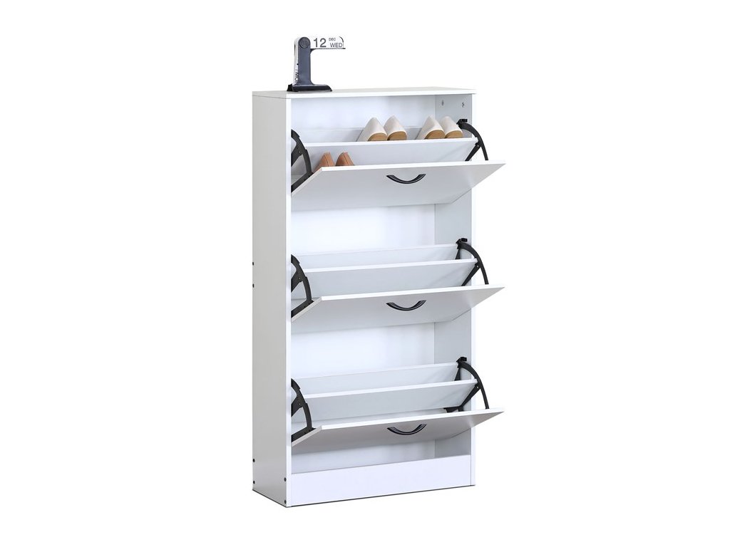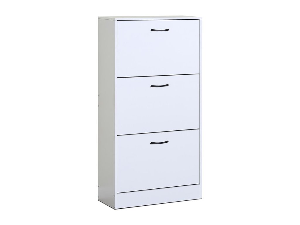 Botník s třemi přihrádkami v čistě bílém provedení je vyroben z MDF desek, které zajišťují pevnost a stabilitu. Každá přihrádka je opatřena černou úchytkou pro snadné otevírání a zavírání, což usnadňuje organizaci obuvi. Kompaktní rozměry umožňují umístění do předsíní i menších prostor, kde poskytuje praktické řešení pro uložení bot. Povrch botníku je hladký a snadno udržovatelný, což přispívá k dlouhé životnosti a čistému vzhledu. Díky jednoduchému designu se hodí do různých stylů interiéru.