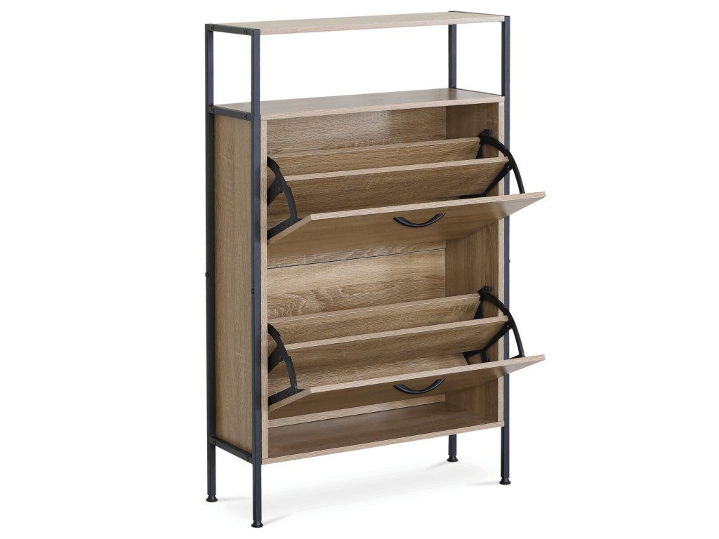 Botník s dvěma přihrádkami a dvěma policemi nabízí praktické řešení pro uspořádání obuvi v domácnosti. Jeho desky jsou vyrobeny z MDF s dekorativním povrchem v odstínu dub, který přináší přírodní vzhled a snadnou údržbu. Stabilní kovová konstrukce v černé barvě zajišťuje pevnost a dlouhou životnost, zatímco úzké nožky umožňují snadné čištění pod botníkem. Dvě prostorné přihrádky s černými úchytkami poskytují dostatek místa pro uložení více párů bot, a horní police může sloužit k odkládání drobných předmětů nebo dekorací. Kompaktní rozměry botníku umožňují jeho umístění i do menších prostor.