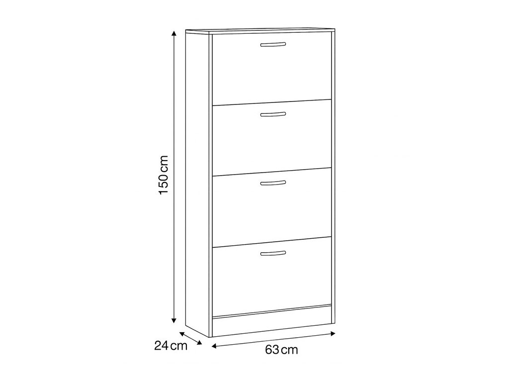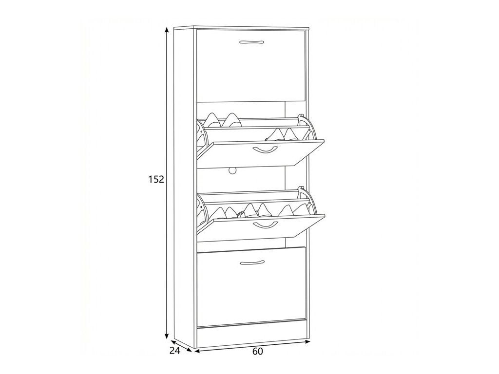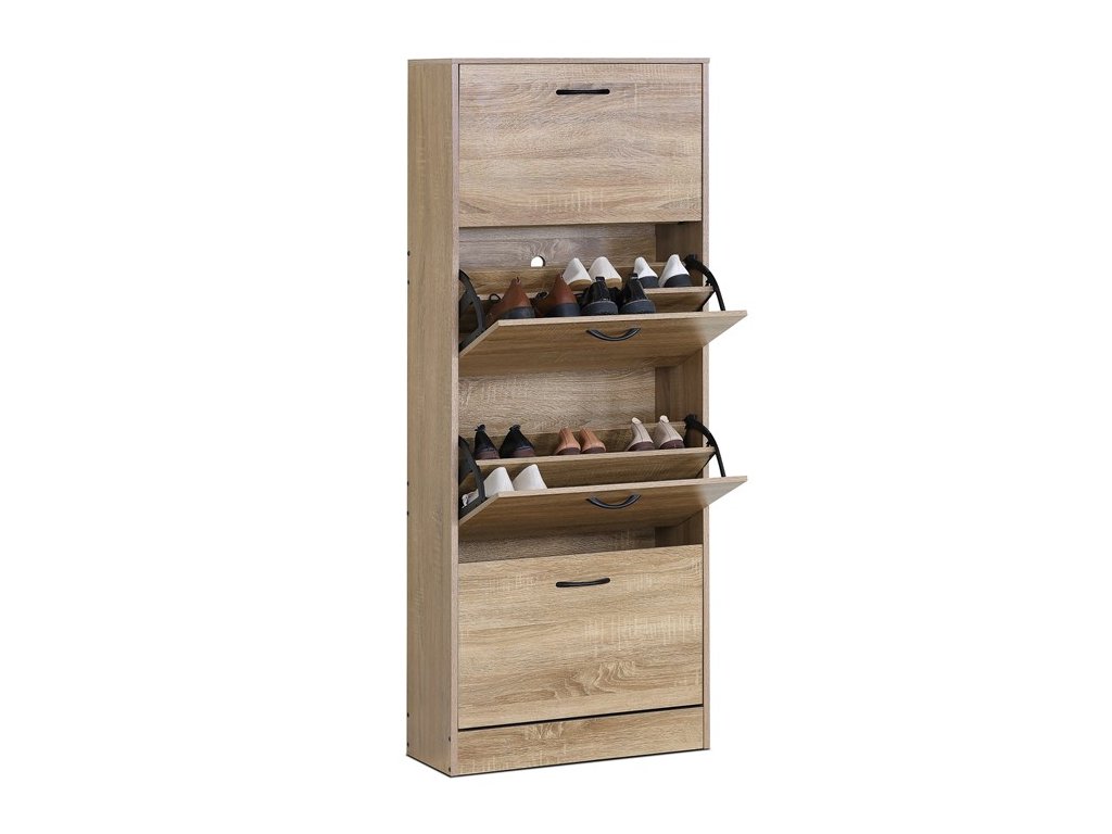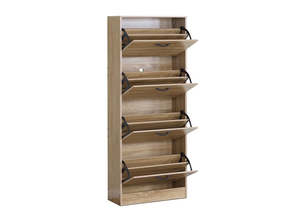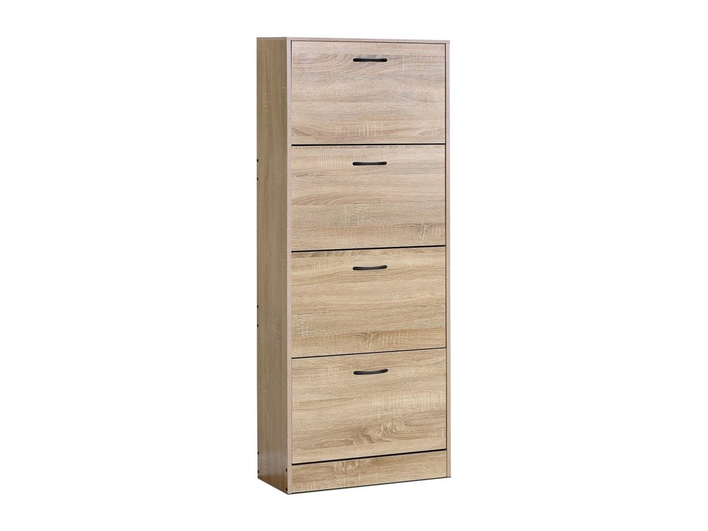 Botník s čtyřmi samostatnými přihrádkami nabízí praktické řešení pro uspořádání obuvi v předsíni či chodbě. Vyroben je z MDF desek s dekorativní povrchovou úpravou v odstínu dub, která napodobuje strukturu dřeva a snadno se udržuje. Každá přihrádka je vybavena černou úzkou úchytkou pro pohodlné otevírání. Kompaktní tvar a vertikální uspořádání šetří místo a zároveň poskytuje dostatek úložného prostoru. Botník je stabilní a navržený pro dlouhou životnost v domácím prostředí.