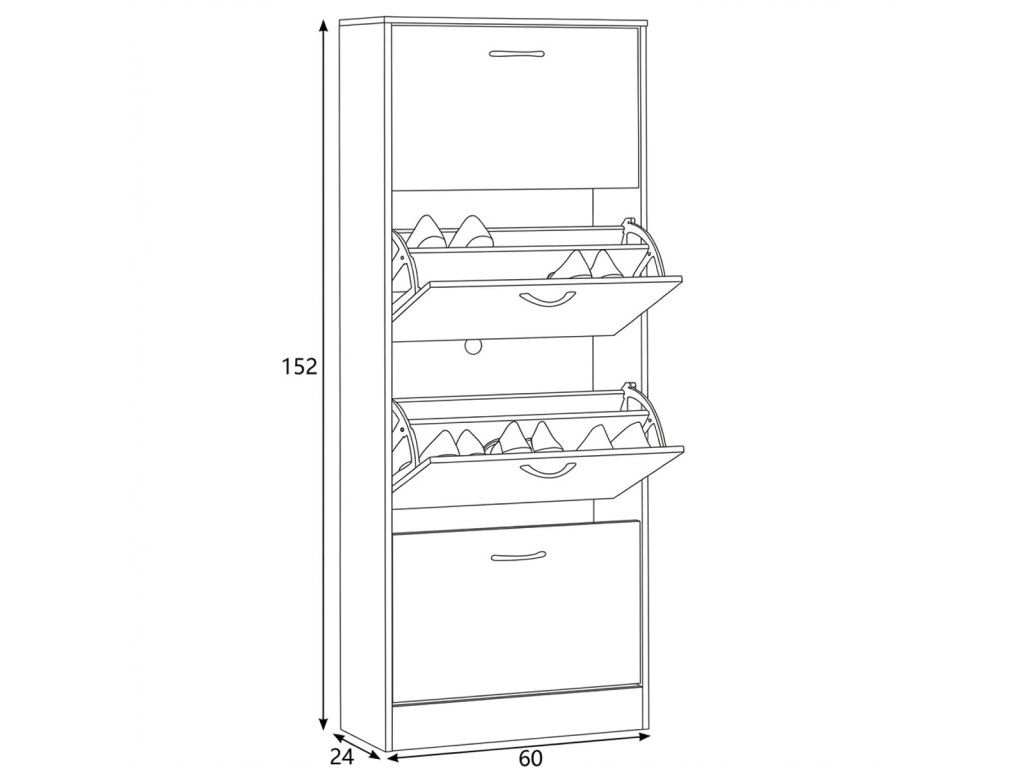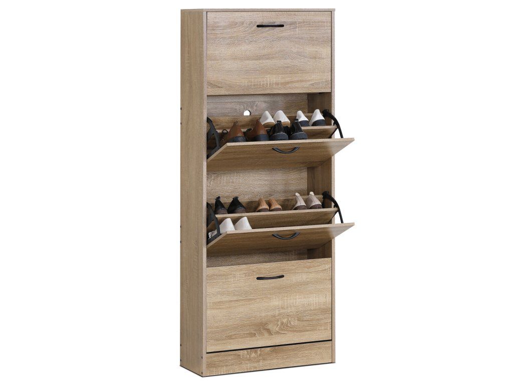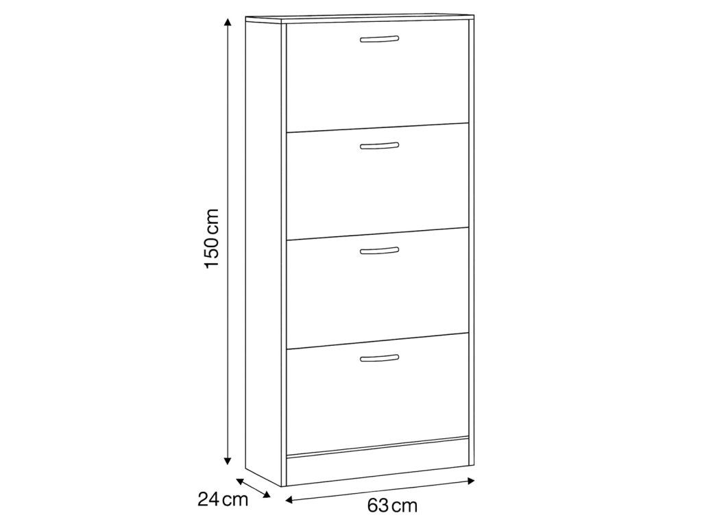 Botník s čtyřmi samostatnými přihrádkami nabízí praktické řešení pro uspořádání obuvi v předsíni či chodbě. Vyroben je z MDF desek s dekorativní povrchovou úpravou v odstínu dub, která napodobuje strukturu dřeva a snadno se udržuje. Každá přihrádka je vybavena černou úzkou úchytkou pro pohodlné otevírání. Kompaktní tvar a vertikální uspořádání šetří místo a zároveň poskytuje dostatek úložného prostoru. Botník je stabilní a navržený pro dlouhou životnost v domácím prostředí.