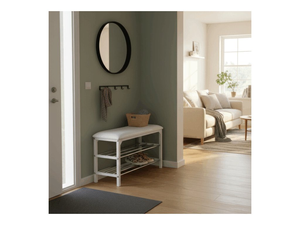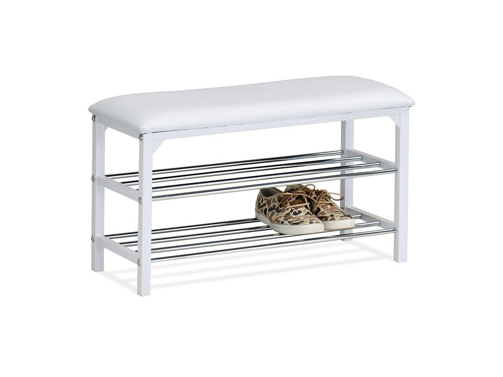 Botník s taburetem kombinuje praktické uspořádání s pohodlným posezením. Černý matný kovový rám je doplněn o dvě chromované police, které poskytují dostatek prostoru pro uložení obuvi. Sedák je potažen černou ekokůží, která se snadno udržuje a nabízí komfortní místo k sezení při obouvání. Kompaktní rozměry a minimalistický design umožňují snadné začlenění do různých interiérů, zejména předsíní a vstupních hal.