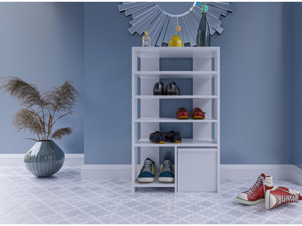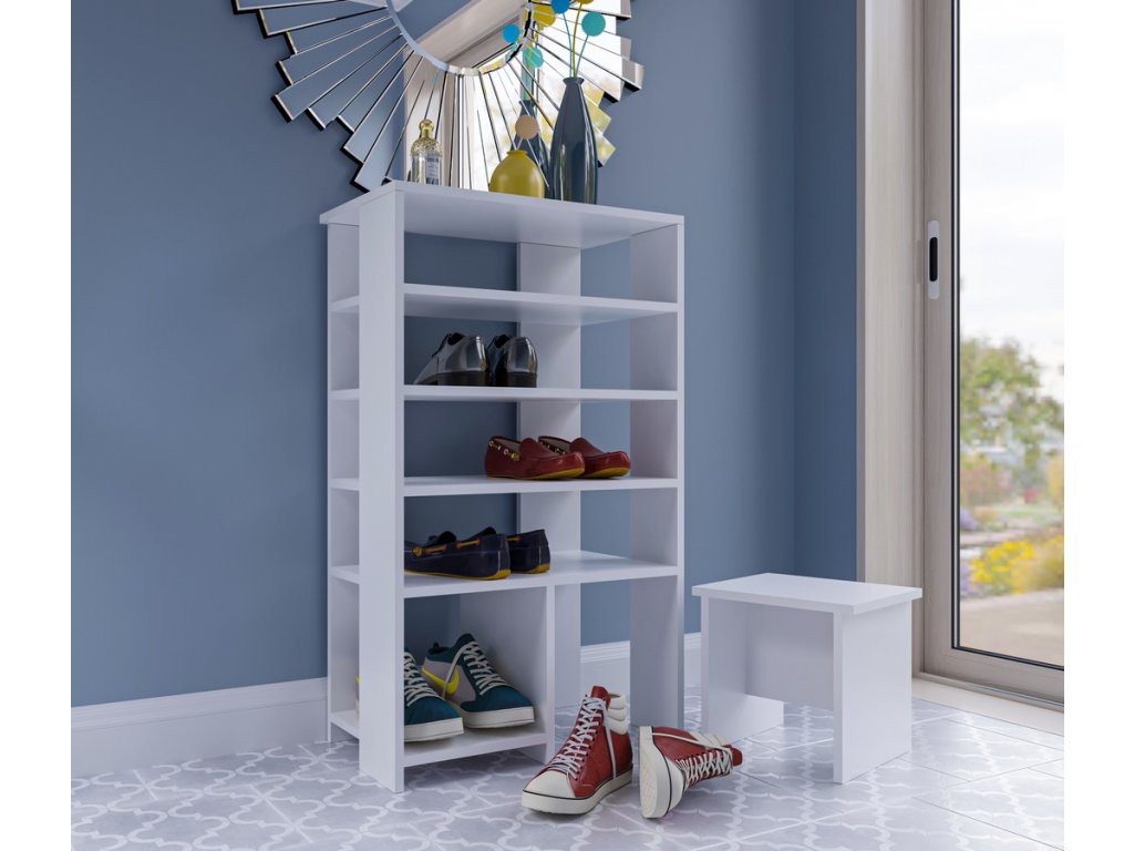 Policový botník se stoličkou v moderním provedení. Stoličku lze schovat do botníku. Botník je vyroben z kvalitního LTD v barvě bílá. Dodáváme v demontovaném stavu.