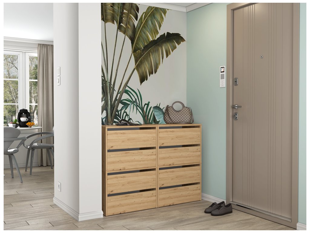 šířka: 67 cm | výška: 125 cm | hloubka: 31 cm Botník se dvěma výklopnými dvířky, vyrobený z desky LTD v barveném provedení dub sonoma. Výklopná dvířka jsou v barvě šedá. K...