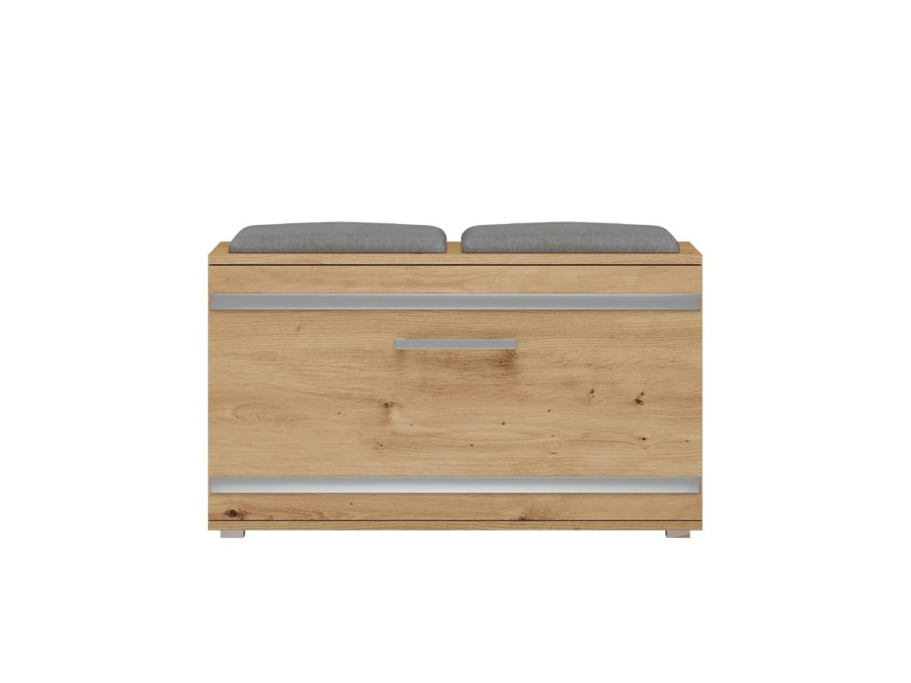 šířka: 70 cm | výška: 47 cm | hloubka: 34 cm Botník s výklopnými dvířky a polstrovaným sedákem je vyroben z desky LTD v kombinaci barev borovice sněžná/antracit. Dodáváme v...