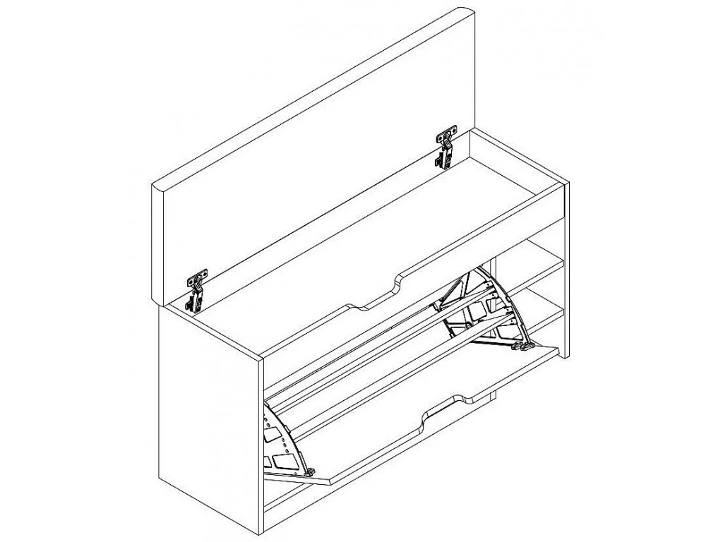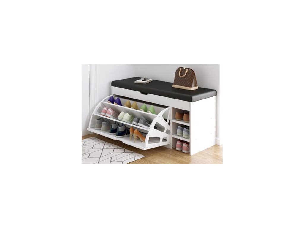 Botník s výklopem a policemi je vyrobený z desky LTD v barvě bílá. Pod výklopným polstrovaným sedákem černé barvy je praktický úložný prostor. Dodáváme v demontovaném stavu.