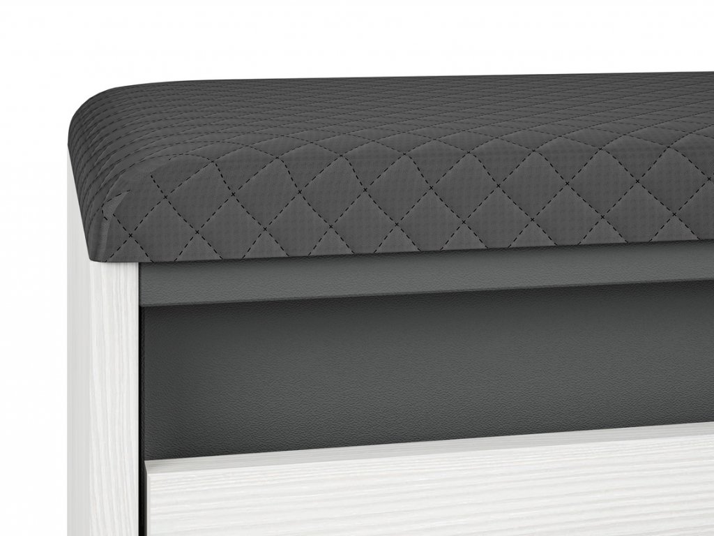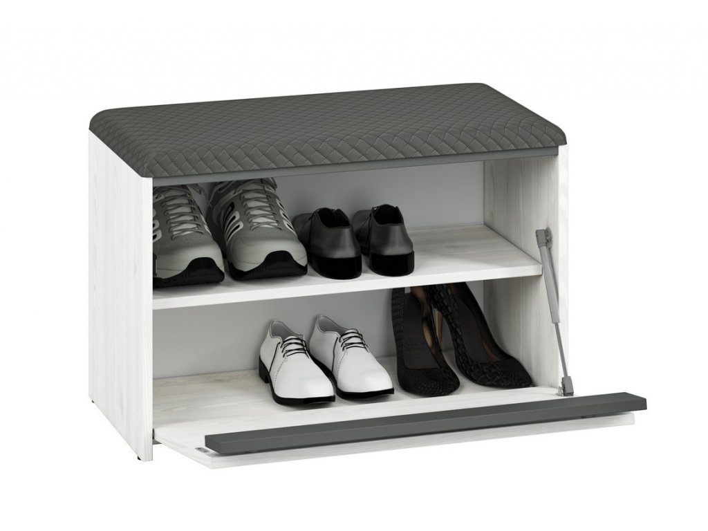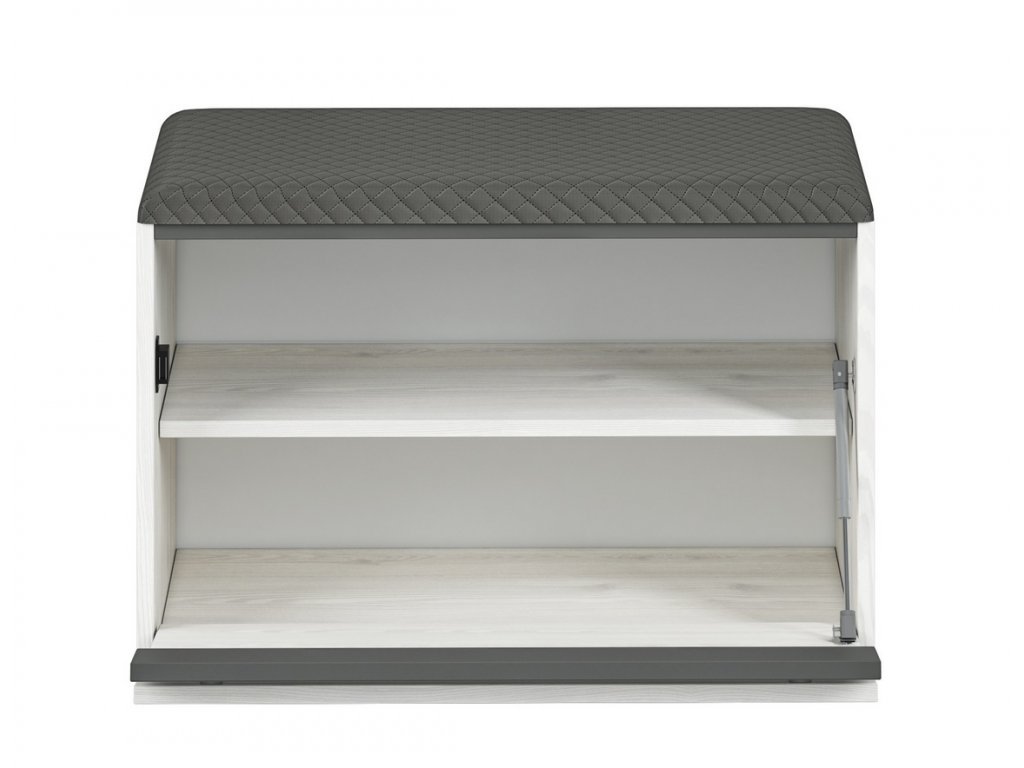 Botník s výklopnými dvířky a polstrovaným sedákem je vyroben z desky LTD v kombinaci barev borovice sněžná/antracit. Dodáváme v demontovaném stavu.