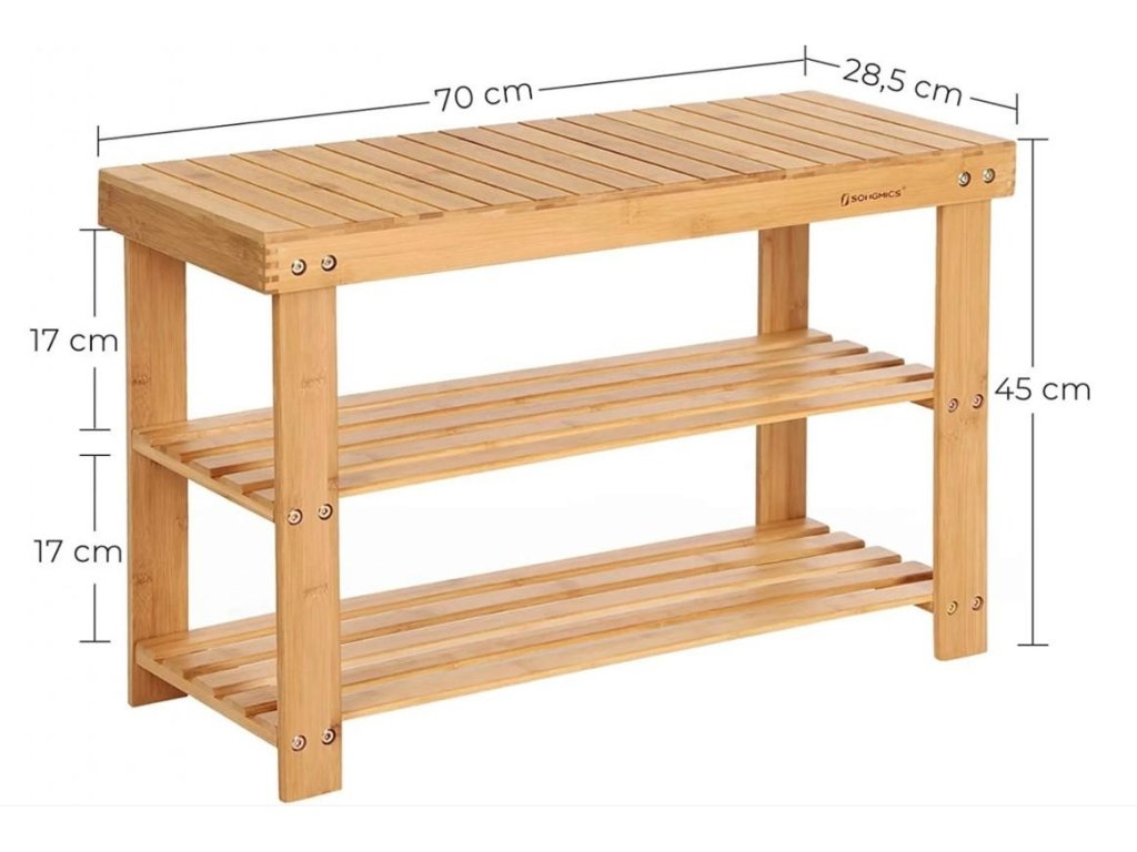 šířka: 90 cm | výška: 47 cm | hloubka: 30 cm Botník je vyroben z bambusu přírodní barvy, polstrovaný sedák je potažený látkou v šedé barvě. Dodáváme v demontovaném stavu.