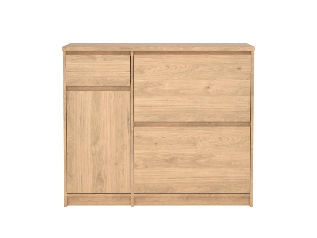 šířka: 90 cm | výška: 66 cm | hloubka: 38 cm Botník s 1 výklopnými dvířky, 1 klasickými dvířky s poličkou a 1 zásuvkou. Je vyroben z desky LTD v barvě dub sonoma. Botník...