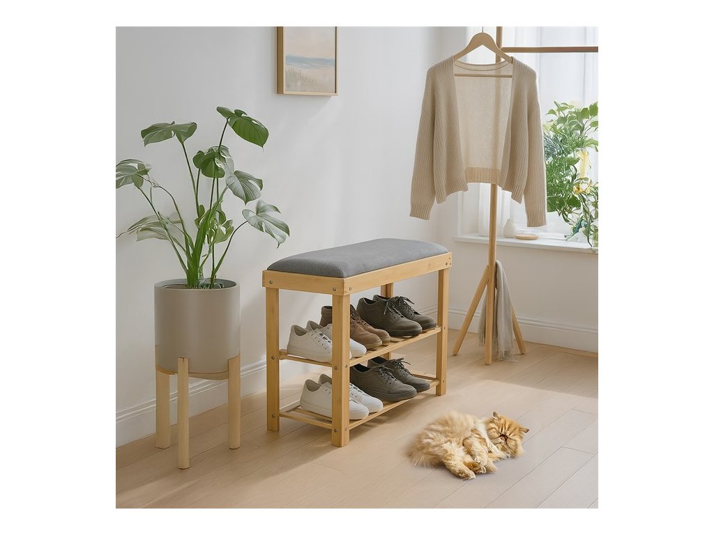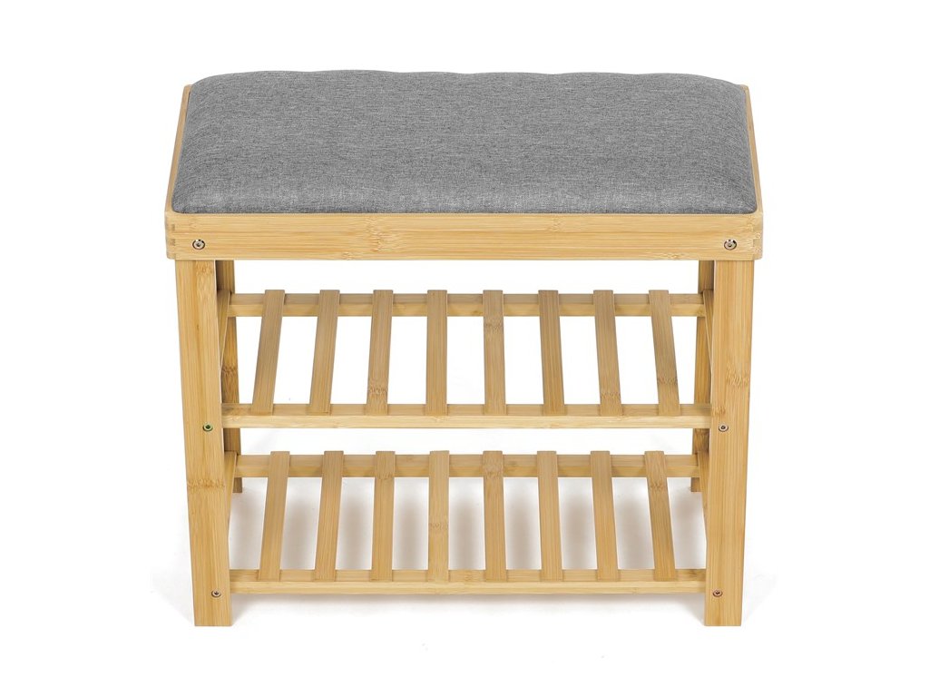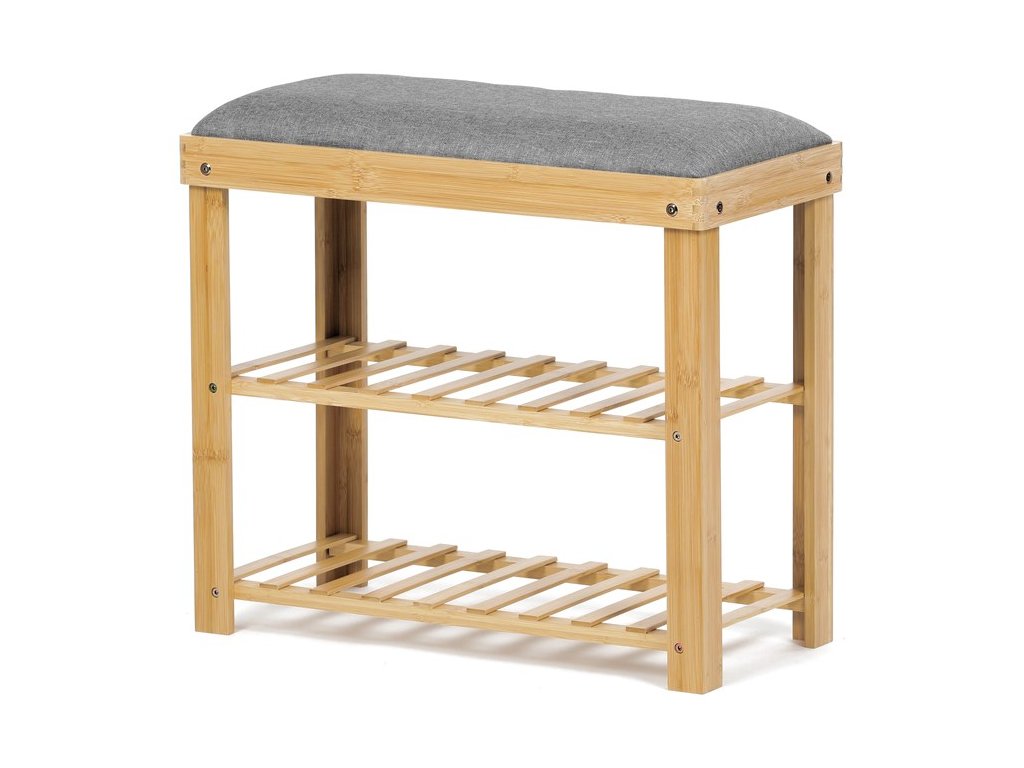 Botník a taburet DR-N1010 GREY2 značky Autronic kombinuje funkčnost s přírodní estetikou díky konstrukci z masivního bambusu v přírodním odstínu, která zajišťuje pevnost a dlouhou životnost. Sedák je čalouněný šedou látkou s jemnou strukturou, která poskytuje pohodlné posezení a zároveň doplňuje minimalistický design. Dvě police tvořené bambusovými latěmi nabízejí praktický úložný prostor pro uložení obuvi nebo drobných předmětů, přičemž otevřená konstrukce umožňuje cirkulaci vzduchu a snadnou údržbu. Robustní rám je sestavený pomocí kovových spojovacích prvků, které zvyšují stabilitu celého výrobku. Kompaktní rozměry a ergonomické tvarování sedáku zajišťují komfortní sezení i v menších prostorách, což činí botník vhodným do předsíní či chodeb s omezeným prostorem. Nosnost výrobku odpovídá běžnému zatížení při sezení a ukládání obuvi, což zaručuje jeho všestranné využití v domácnostech s důrazem na přírodní materiály a jednoduchý design.