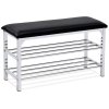 Botník s dvěma policemi nabízí praktické řešení pro uspořádání obuvi v předsíni či chodbě. Jeho pevné kovové tělo s chromovaným povrchem zajišťuje stabilitu a snadnou údržbu, zatímco čalouněný sedák potažený černou ekokůží poskytuje pohodlné místo k sezení při obouvání. Dvě otevřené police umožňují přehledné uložení více párů bot. Kompaktní rozměry a jednoduchý design usnadňují začlenění do různých interiérových stylů.