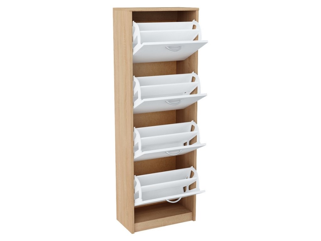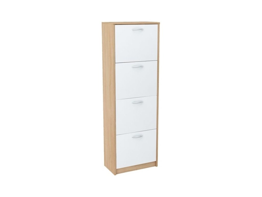 Čtyřdveřový botník výklopný v moderním provedení. Korpus je v barvě dub sonoma a dvířka jsou v barvě bílá mat. Korpus i dvířka jsou z kvalitního LTD. Lamino je odolné vůči vysokým teplotám, poškrábání a nárazům, hraněné ABS páskou. Jasně viditelná struktura dřeva. Dodáváme v demontovaném stavu.
