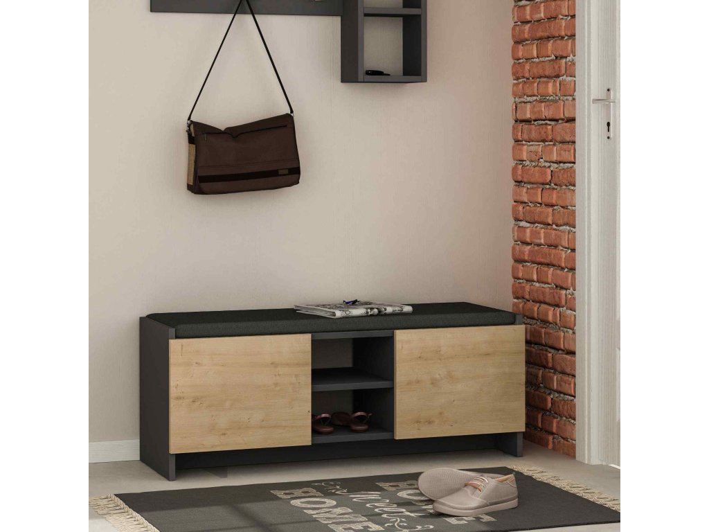 Díky svému jedinečnému kombinovanému designu v barvách antracitu a dubu přináší do vašeho domova nádech luxusu. Vysoce kvalitní melamin, VT laminát a látka zajišťují odolnost a dlouhou životnost. Funkční dvířka skrývají prostornou skříňku pro vaše boty, zatímco praktický regálek a lavice poskytují další úložný prostor a místo k sezení.