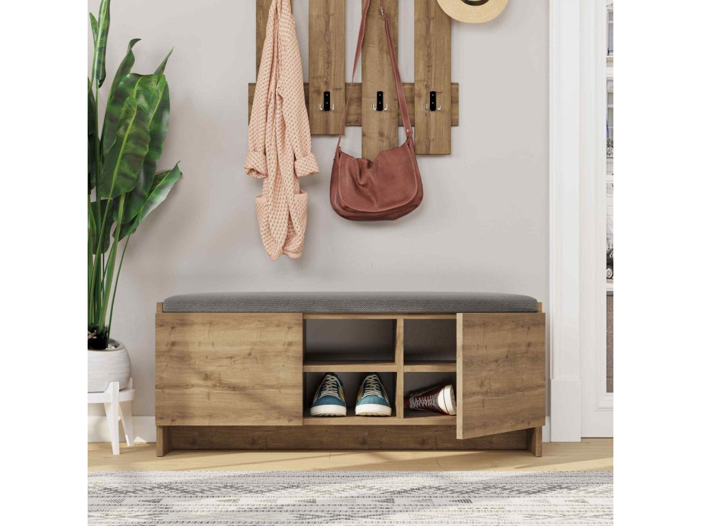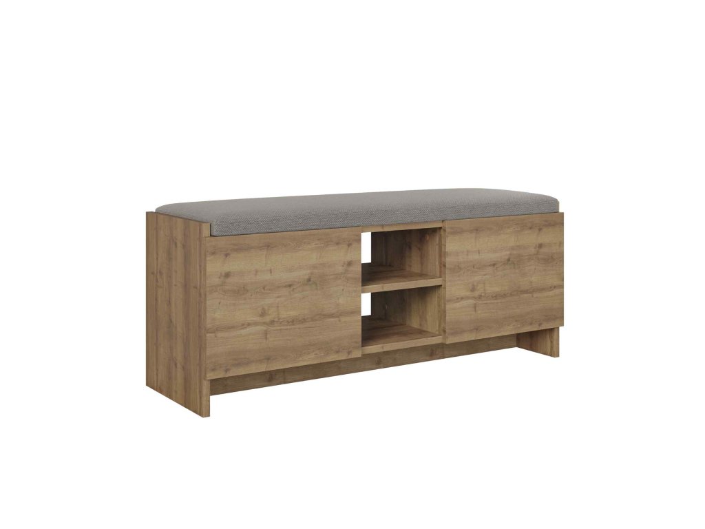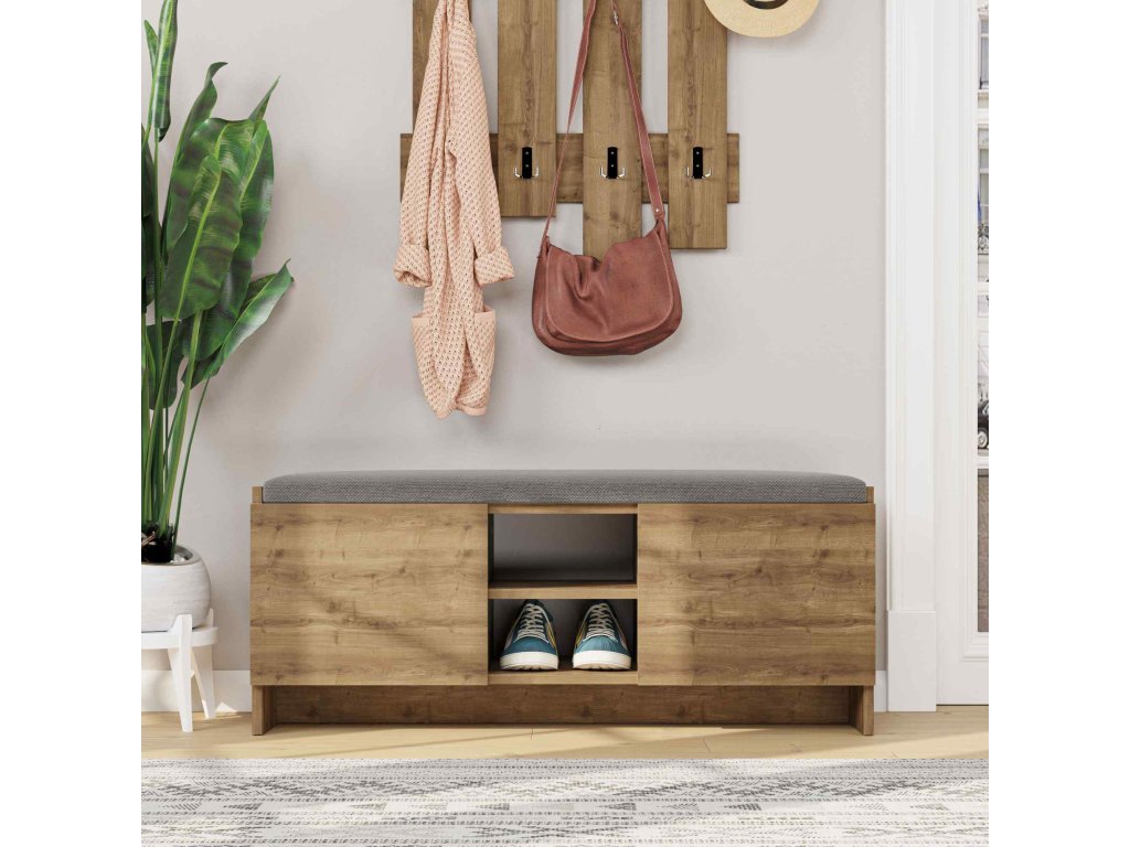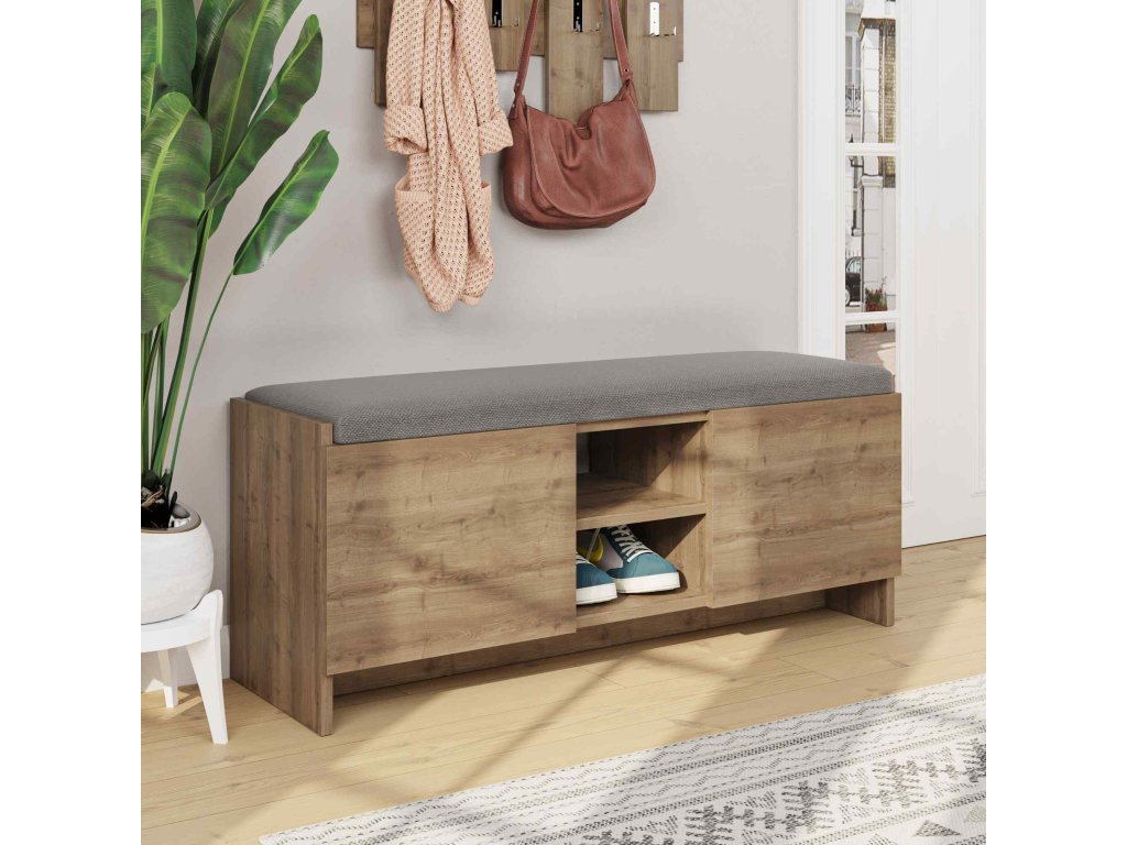 je vyroben z kvalitních materiálů, jako je melamin, VT laminát a látka, což zajišťuje jeho odolnost a dlouhou životnost. Dvířka skrývají úložný prostor pro vaše boty a další příslušenství, zatímco regálek a pohodlná lavice nabízejí dodatečné místo pro uskladnění a komfortní sezení. Je to ideální doplněk pro každou předsíň hledající spojení estetiky a funkce.