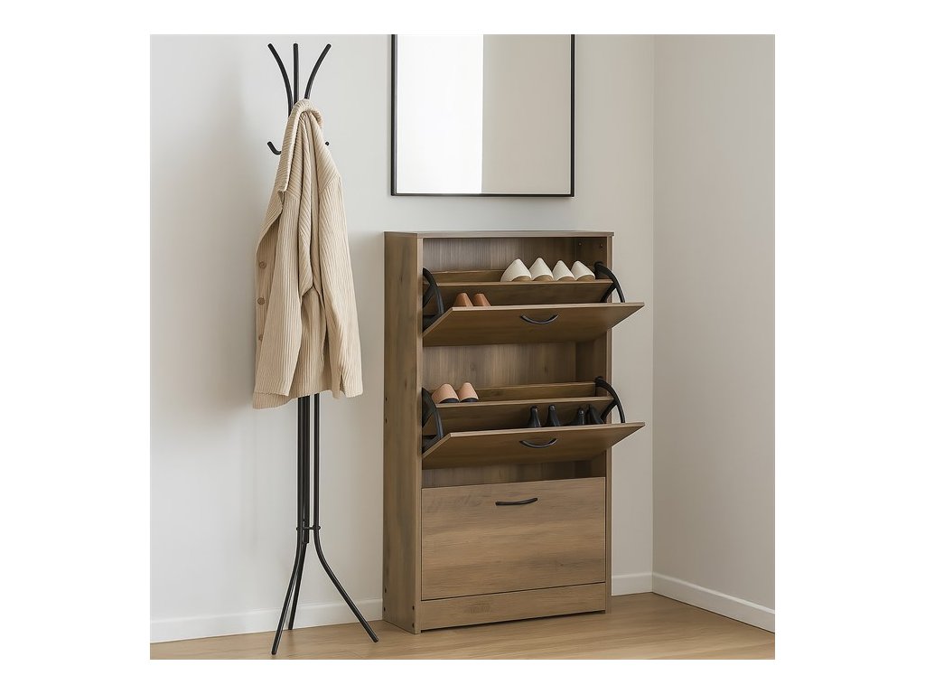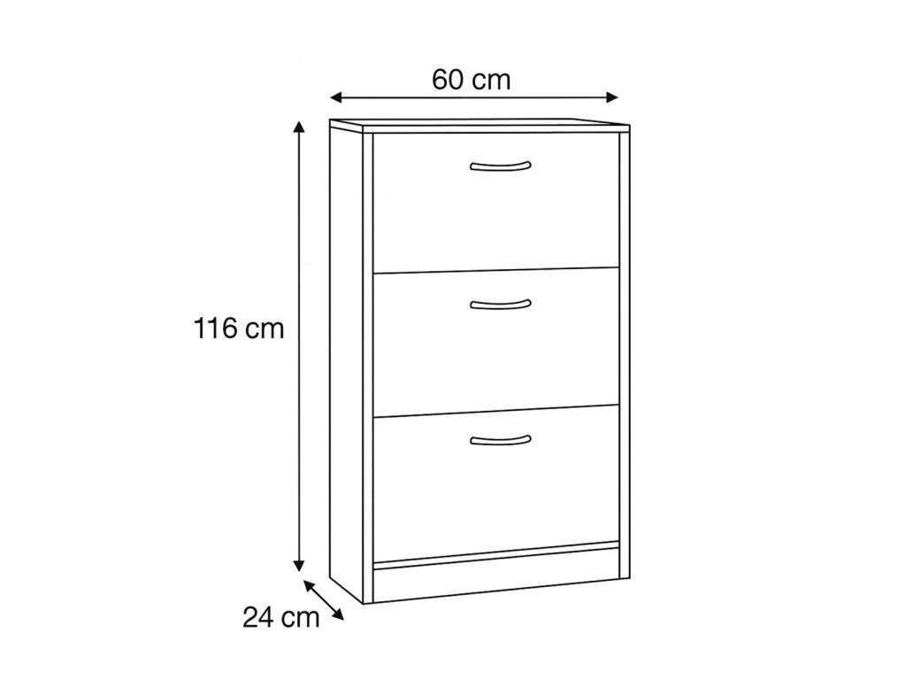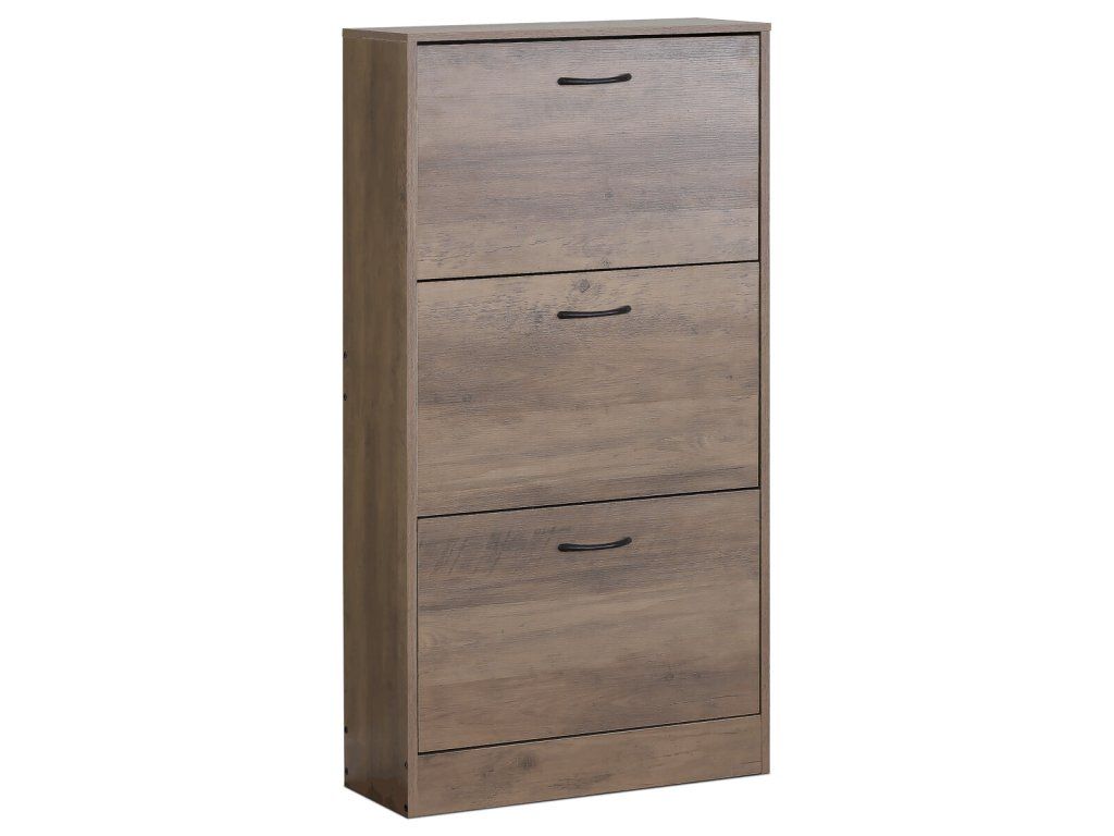Botník s třemi přihrádkami v dekoru jilmového dřeva je vyroben z MDF desek s povrchovou úpravou, která napodobuje přirozenou strukturu dřeva. Každá přihrádka nabízí dostatek prostoru pro uskladnění obuvi a je opatřena černými kovovými úchytkami pro snadné otevírání. Kompaktní rozměry botníku umožňují jeho umístění i do menších prostor, přičemž pevná konstrukce zajišťuje stabilitu a dlouhou životnost. Praktické řešení v podobě tří samostatných přihrádek pomáhá udržet pořádek a přehlednost v domácnosti. Botník je vhodný do předsíní, chodeb či šaten, kde efektivně využije dostupné místo.