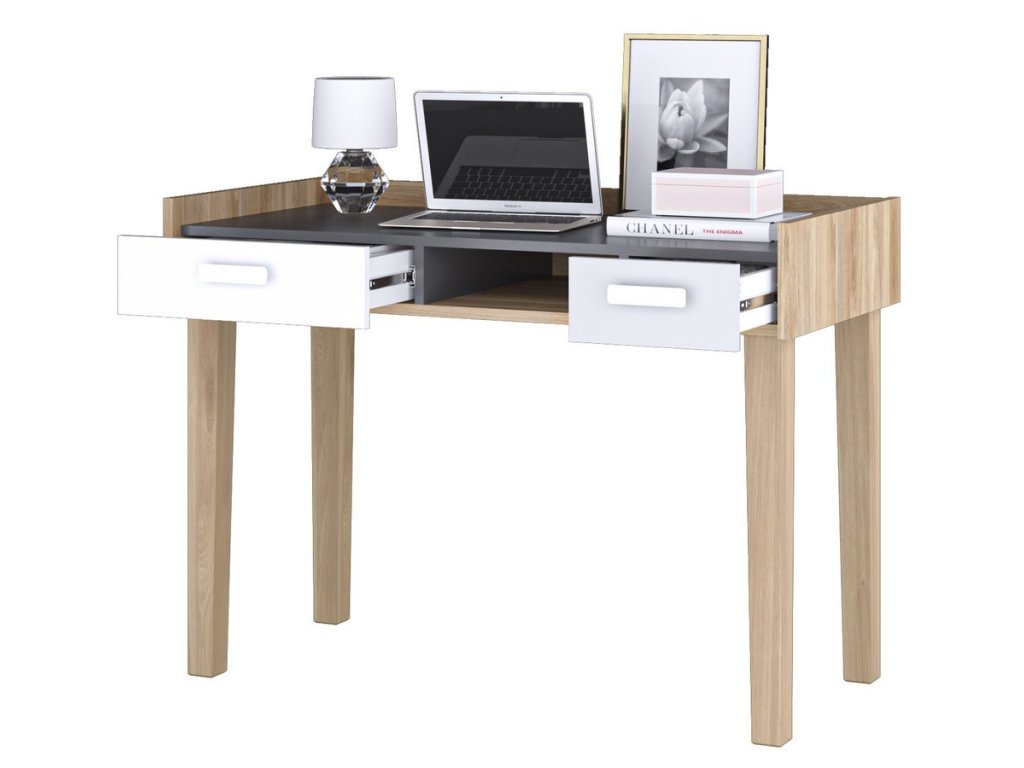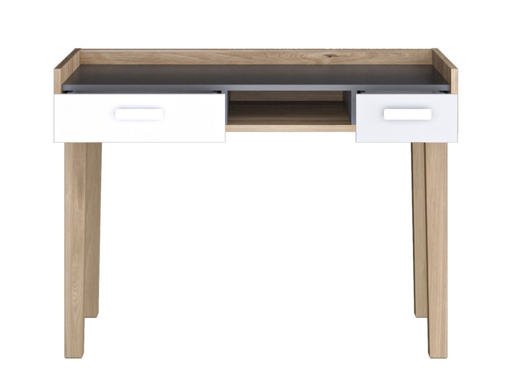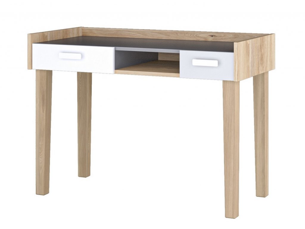 Pracovní stůl se dvěma zásuvkami v moderním stylu a geometrických tvarech. Nábytek je vyroben z desky LTD hraněné páskou ABS, korpus je v barvě dub castello medový, zásuvky jsou v barvě bílá alpská a šedá. Snížená pracovní deska zabraňuje padání věcí ze stolu. Nožky mají netradiční zkosený tvar. Dodáváme v demontovaném stavu.Doplňkové parametry