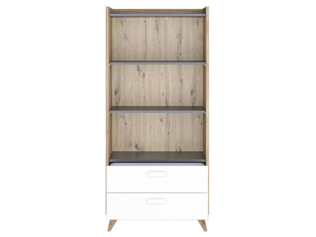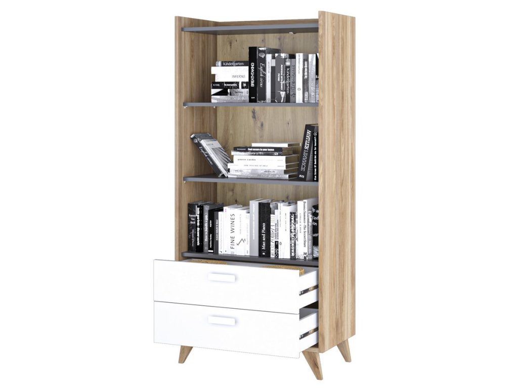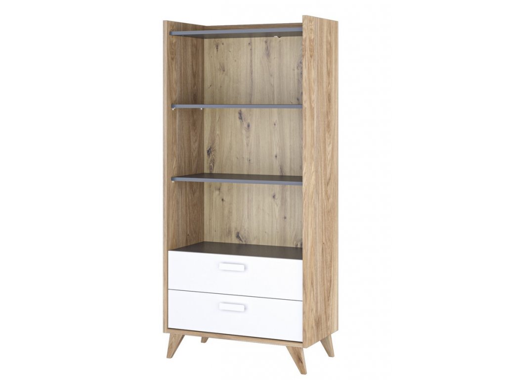 Regál se dvěma zásuvkami v moderním stylu a geometrických tvarech. Nábytek je vyroben z desky LTD hraněné páskou ABS, korpus je v barvě dub castello medový, zásuvky jsou v barvě bílá alpská, police jsou v šedé barvě. Zatížení polic max. 5 kg. Nožky mají netradiční zkosený tvar. Dodáváme v demontovaném stavu.Doplňkové parametry