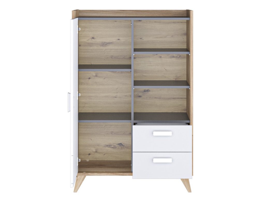 Komoda jednodveřová se dvěma zásuvkami v moderním stylu a geometrických tvarech. Nábytek je vyroben z desky LTD hraněné páskou ABS, korpus je v barvě dub castello medový, dvířka jsou v barvě bílá alpská, zásuvky jsou v šedé barvě. Zatížení polic max. 5 kg. Nožky mají netradiční zkosený tvar. Dodáváme v demontovaném stavu.Doplňkové parametry