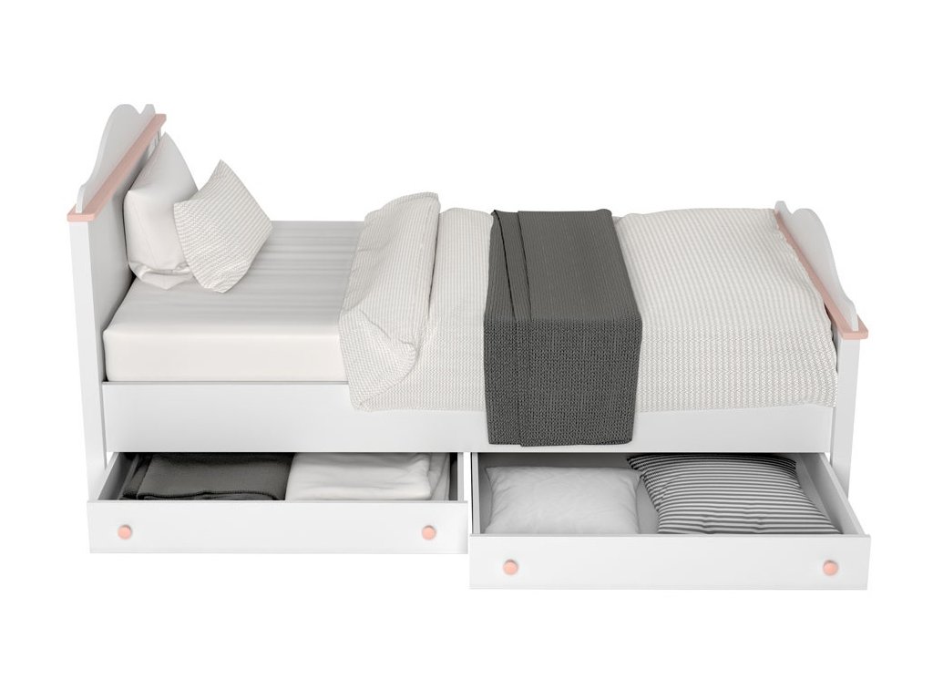 Postel s bonelovou matrací 90 x 200 cm. Tento elegantní nábytek dodá romantickou atmosféru pokojíčku malé princezny i větší slečny. Postel je vyrobena z desky LTD v barvě bílé s doplňkovou barvou růžovou. Postel je dodávána včetně matrace. K posteli je možné dokoupit až 2 zásuvky pod postel. Dodáváme v demontovaném stavu.Doplňkové parametry