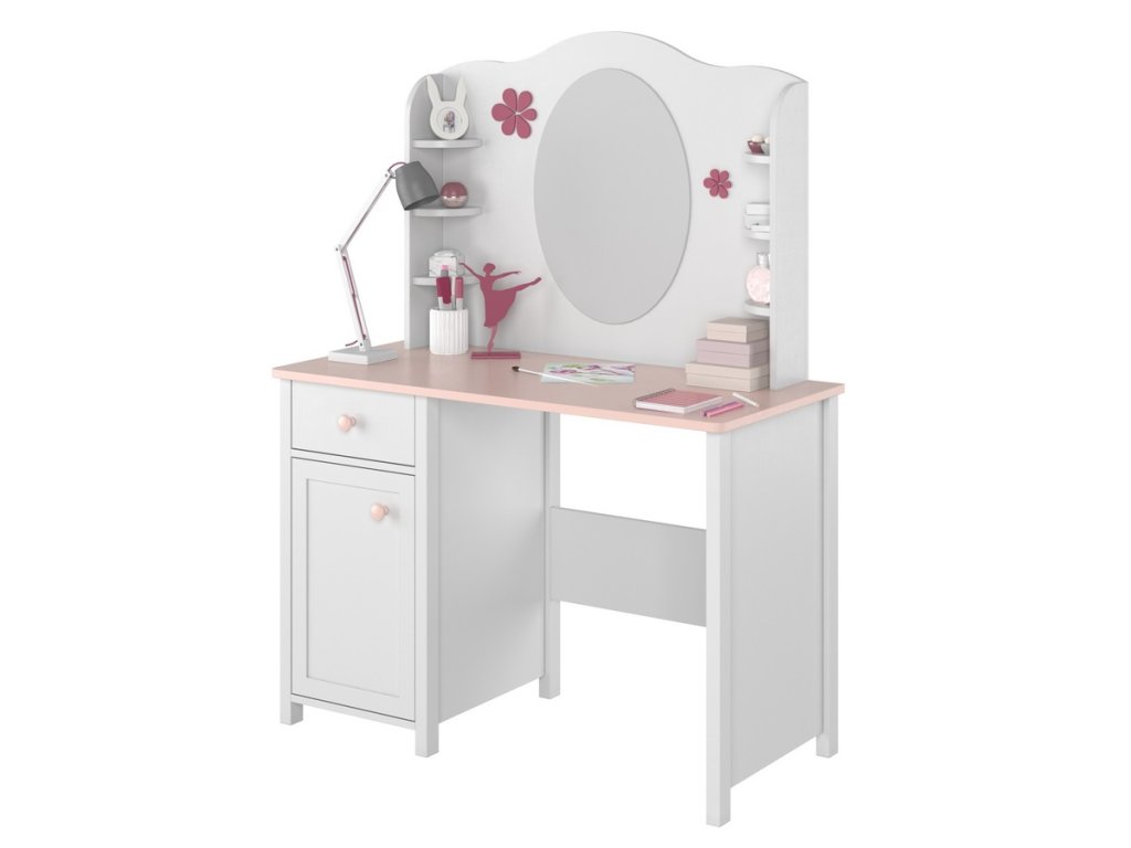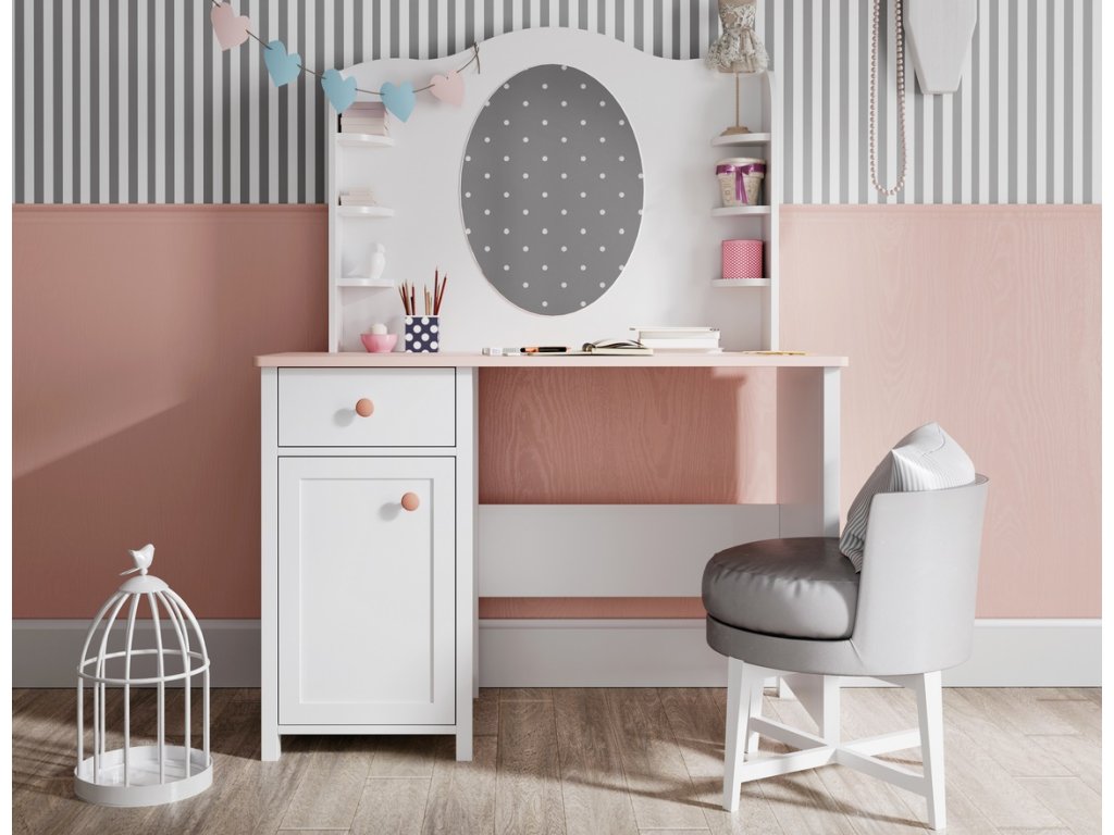 Toaletka se zrcadlem. Tento elegantní nábytek dodá romantickou atmosféru pokojíčku malé princezny i větší slečny. Nástavec je vyroben z desky LTD v barvě bílé. Nástavec je možné kombinovat s psacím stolem 03 nebo komodou 05, upevňuje se úchytkami v zadní části stolu (komody). Dodáváme v demontovaném stavu.Doplňkové parametry