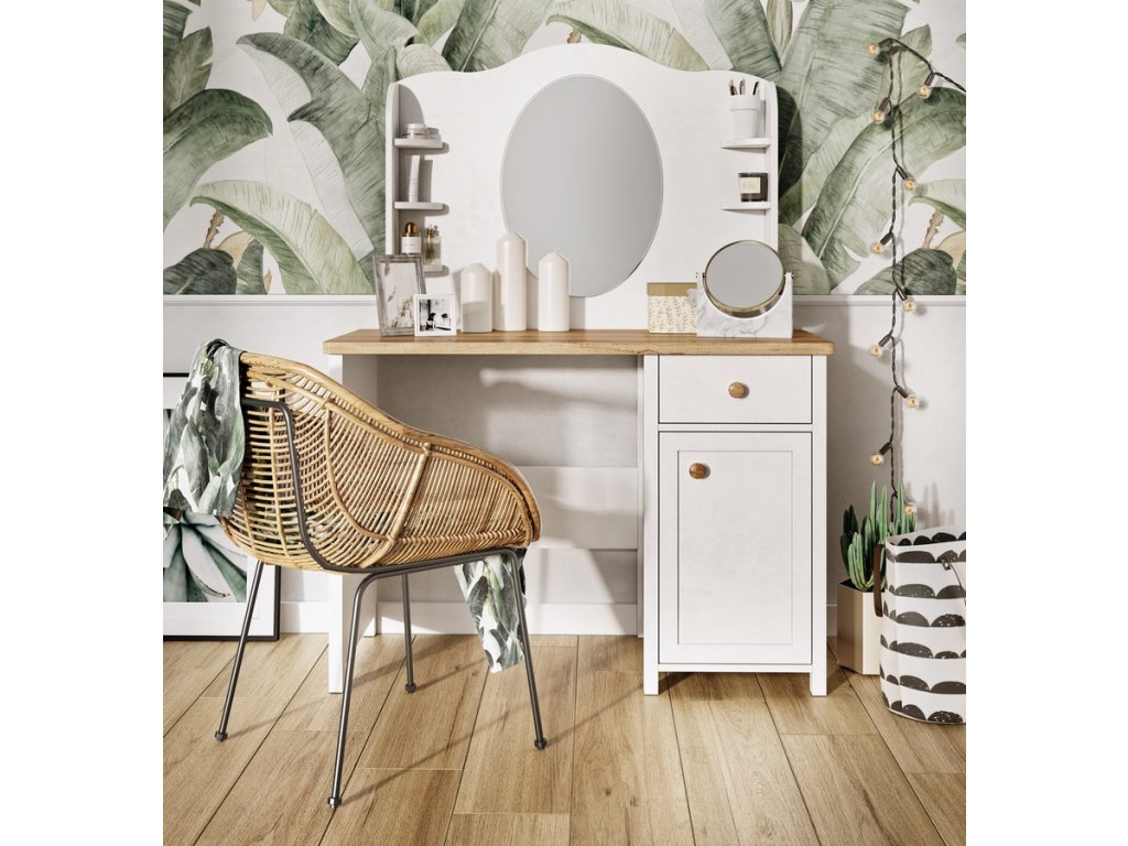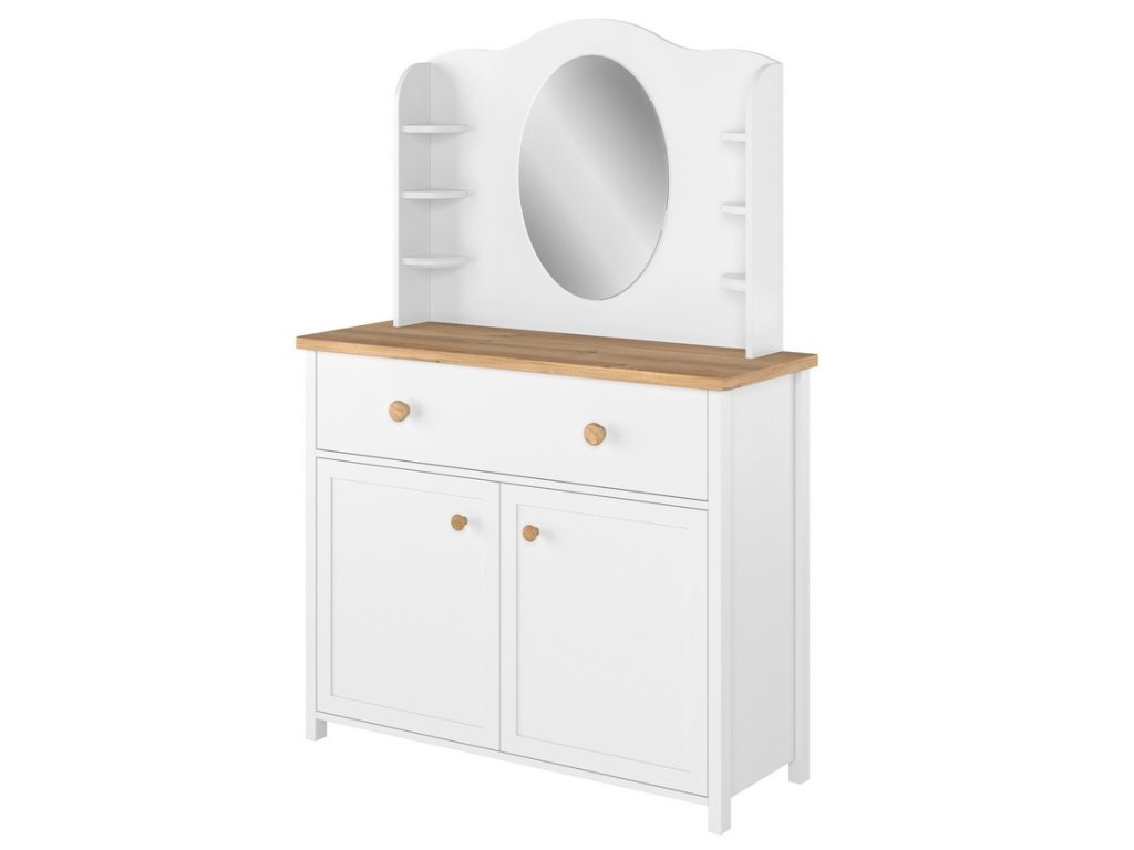 Nádstavec se zrcadlem. Tento elegantní nábytek dodá romantickou atmosféru pokojíčku malé princezny i větší slečny. Nástavec je vyroben z desky LTD v kombinaci s MDF v barvě bílé. Nástavec je možné kombinovat s psacím stolem 03 nebo komodou 05, upevňuje se úchytkami v zadní části stolu (komody). Dodáváme v demontovaném stavu.Doplňkové parametry