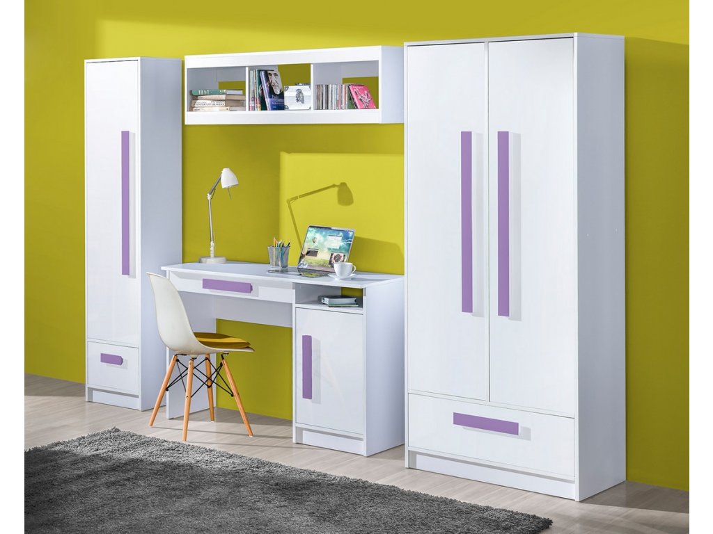 Sestava do dětského pokoje ze sektorové řady, která se vyznačuje netradičním zpracováním barev a originalitou úchytů. Tento styl nábytku zaujme každou mladší generaci. Nábytek je vyroben z kvalitní LTD desky hraněné ABS lištou. Korpus je v barvě bílá mat, dveře jsou barvě bílá lesk. Úchytky jsou v barvě fialové. Sestava se skládá z těchto položek (Š x V x H) - policová skříň (40 x 191 x 40 cm), pracovní stůl (120 x 80 x 50 cm), závěsná police (120 x 41 x 32 cm) a šatní skříň (80 x 191 x 50 cm). Tento nábytek má široký výběr prvků, který Vám zaručí sestavit si dětský nebo studentský pokoj, ložnici či kancelář podle svých potřeb, přání a představ. Dodáváme v demontovaném stavu.Doplňkové parametry