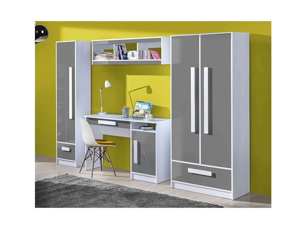 Sestava do dětského pokoje ze sektorové řady, která se vyznačuje netradičním zpracováním barev a originalitou úchytů. Tento styl nábytku zaujme každou mladší generaci. Nábytek je vyroben z kvalitní LTD desky hraněné ABS lištou. Korpus je v barvě bílá mat, dveře jsou barvě šedá lesk. Úchytky jsou v barvě bílé. Sestava se skládá z těchto položek (Š x V x H) - policová skříň (40 x 191 x 40 cm), pracovní stůl (120 x 80 x 50 cm), závěsná police (120 x 41 x 32 cm) a šatní skříň (80 x 191 x 50 cm). Tento nábytek má široký výběr prvků, který Vám zaručí sestavit si dětský nebo studentský pokoj, ložnici či kancelář podle svých potřeb, přání a představ. Dodáváme v demontovaném stavu.Doplňkové parametry