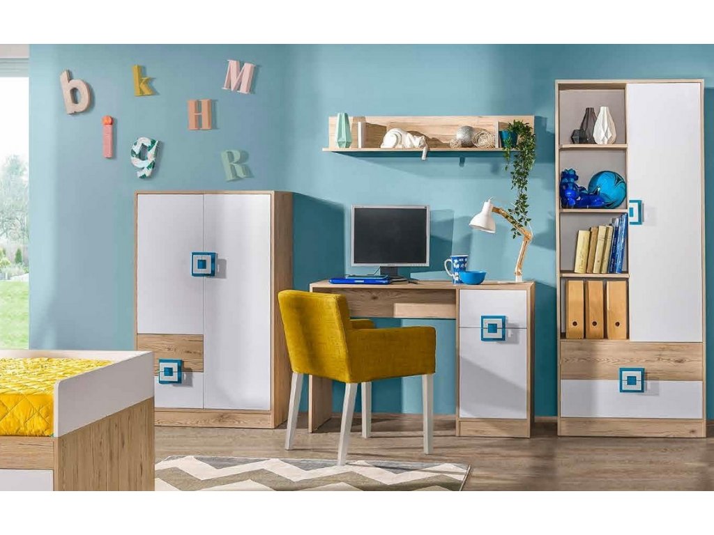 Dětský pokoj, který se vyznačuje netradičním zpracováním barev a originalitou úchytů. Tento styl nábytku zaujme každou mladší generaci. Sestava se skládá ( šxhxv ) - regál ( 80 x 40 x 190 cm ), komoda ( 80 x 40 x 130 cm ), pc stolek ( 120 x 50 x 78 cm ) a police ( 120 x 20 x 20 cm ). Nábytek je vyrobena z kvalitní LTD desky hraněné ABS lištou. Korpus je v barvě dub jasný, dveře jsou v kombinaci barev bílá mat / dub jasný. Úchytky jsou v barevné kombinaci tyrkys / bílá. Jednotlivé díly lze koupit zvlášť. Sektorový nábytek NIKO má široký výběr prvků, který Vám zaručí sestavit si dětský nebo studentský pokoj, ložnici či kancelář podle svých potřeb, přání a představ. Dodáváme v demontovaném stavu.Doplňkové parametry