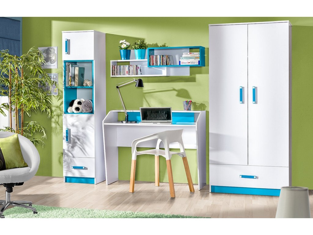 Sestava do dětského pokoje, která se vyznačuje netradičním zpracováním barev a originalitou úchytů. Tento styl nábytku zaujme každou mladší generaci. Nábytek je vyroben z kvalitní LTD desky hraněné ABS lištou. Korpus i dveře jsou v bílé matné barvě doplněné barvou tyrkys. Sestava se skládá z těchto položek (Š x V x H) - kombinovaná skříň (45 x 189 x 40 cm), šatní skříň (90 x 189 x 50 cm), závěsná police (120 x 34 x 26 cm) a pracovní stůl (120 x 91 x 50 cm). Široký výběr prvků Vám zaručí sestavit si dětský nebo studentský pokoj podle svých potřeb, přání a představ. Dodáváme v demontovaném stavu.Doplňkové parametry