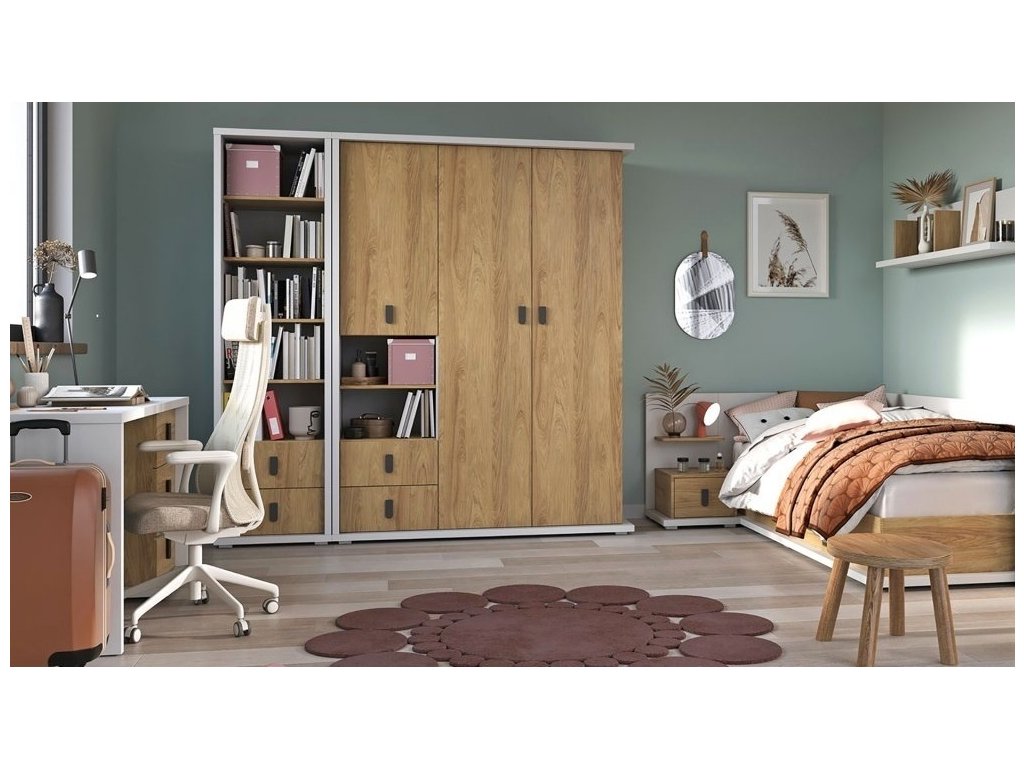 Sestava dětského pokoje v jemném přírodním stylu. Korpus je vyroben z desky LTD v barvě bílá, dvířka, zásuvky a police jsou vyrobeny z desky LTD v barvě ořech natural. Sestava se skládá z těchto komponentů (Š x V x H cm) - skříň třídveřová (150 x 200 x 55 cm), regál se zásuvkami (55 x 200 x 55 cm), pracovní stůl (126 x 75 x 55 cm), závěsná police (120 x 30 x 22 cm), noční stolek levý (43 x 70 x 45 cm) a postel s úložným prostorem levá (102 x 70 x 212 cm). Součástí postele je i bonelová matrace. Dodáváme v demontovaném stavu.Doplňkové parametry