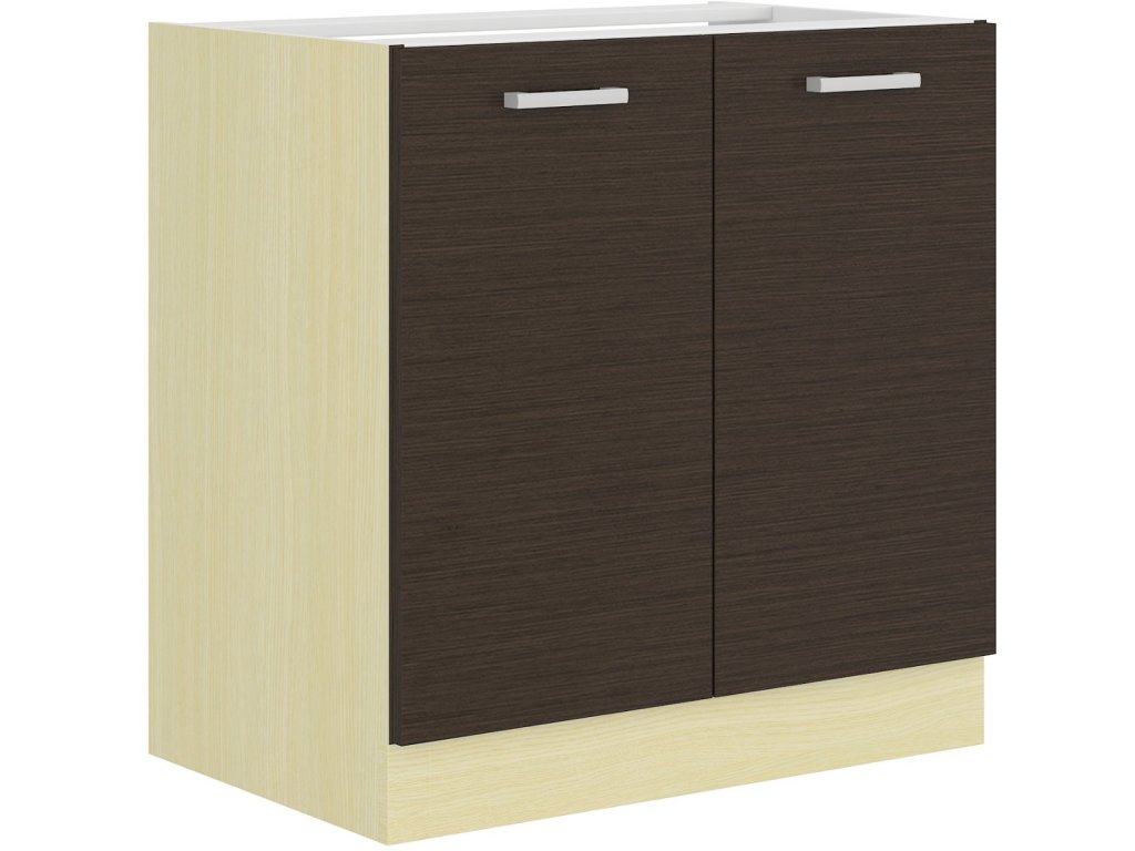 Dolní skříňka dvoudveřová pod dřez CHAMONIX II vyrobená z kvalitního lamina. Korpus i sokl ( 10 cm ) jsou v barvě dub ferrara a dvířka v barvě dub tmavé legno. Rozměry skříňky - šířka 80 cm, výška 82 cm, hloubka 52 cm. Skříňka nemá zadní desku kvůli odpadním trubkám. Skříňka neobsahuje pracovní desku, což je vhodné při koupi celoplošného dřezu. Při koupi vestavného dřezu je třeba pracovní desku doobjednat. Úchyty jsou z plastu. V naší nabídce naleznete další výběr skříněk k sestavení celé kuchyně.Doplňkové parametry