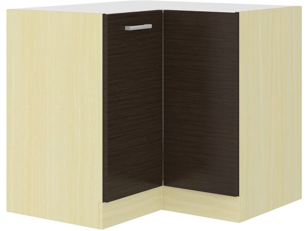 Dolní skříňka rohová CHAMONIX II vyrobená z kvalitního lamina. Korpus i sokl ( 10 cm ) jsou v barvě dub ferrara a dvířka v barvě dub tmavé legno. Rozměry skříňky - šířka 89 x 89 cm, výška 82 cm, hloubka 52 cm. Pracovní deska není v ceně. Úchyty jsou z plastu. Dvířka mají pravé otvírání. V naší nabídce naleznete další výběr skříněk k sestavení celé kuchyně.Doplňkové parametry