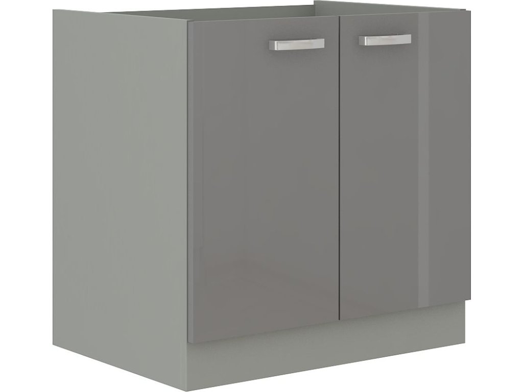 Dolní skříňka pod dřez GREY vyrobená z kvalitního lamina a MDF. Korpus, sokl ( 10 cm ) je v barvě šedá a dvířka jsou v barvě grey šedá v lesku. Rozměry skříňky - šířka 80 cm, výška 82 cm, hloubka 52 cm. Skříňka nemá zadní desku kvůli odpadním trubkám. Skříňka neobsahuje pracovní desku, což je vhodné při koupi celoplošného dřezu. Při koupi vestavného dřezu je třeba pracovní desku doobjednat. Úchyty jsou z kovu. V naší nabídce naleznete další výběr skříněk k sestavení celé kuchyně.Doplňkové parametry