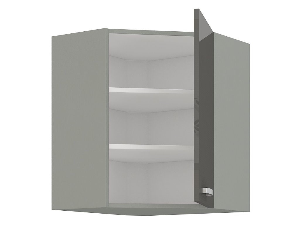 Horní skříňka rohová GREY vyrobená z kvalitního lamina a MDF. Korpus je v barvě šedá a dvířka v barvě grey šedá v lesku. Rozměry skříňky - šířka 59 x 59 cm, výška 71,5 cm, hloubka 31 cm. Úchyty jsou z kovu. Dvířka mají pravé otvírání. V naší nabídce naleznete další výběr skříněk k sestavení celé kuchyně.Doplňkové parametry