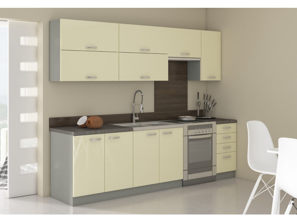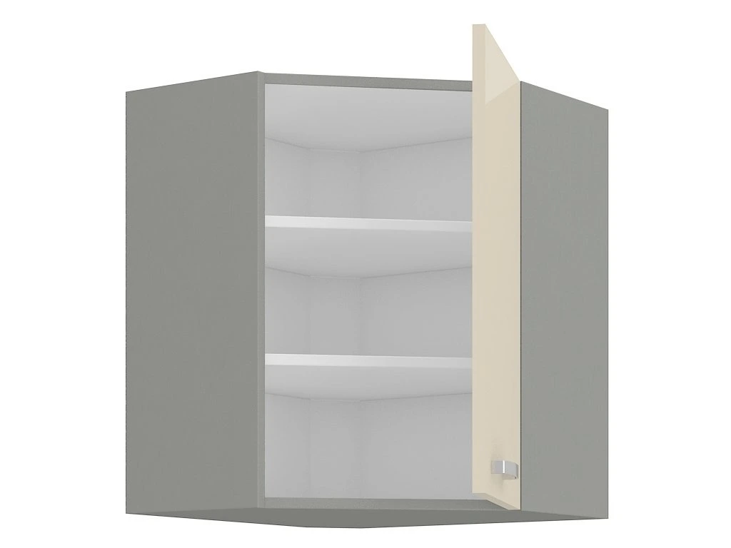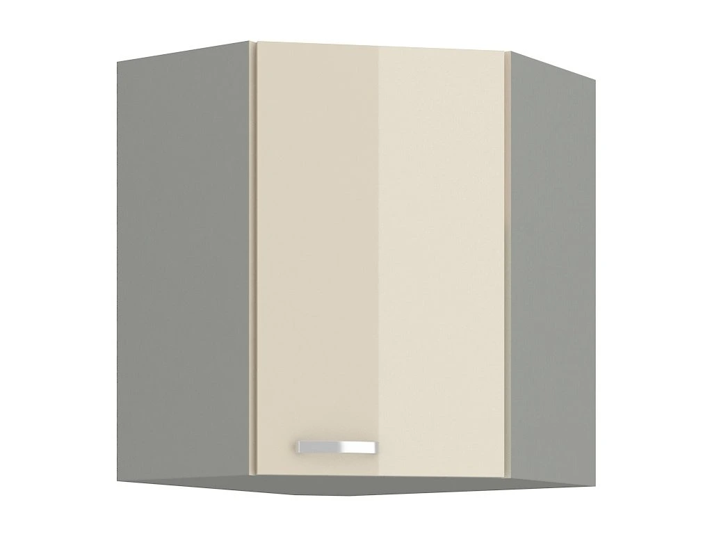 Horní skříňka rohová KARMEN vyrobená z kvalitního lamina a MDF. Korpus je v barvě šedá a dvířka v barvě karmen krémová v lesku. Rozměry skříňky - šířka 59 x 59 cm, výška 71,5 cm, hloubka 31 cm. Úchyty jsou z kovu. Dvířka mají pravé otvírání. V naší nabídce naleznete další výběr skříněk k sestavení celé kuchyně.Doplňkové parametry