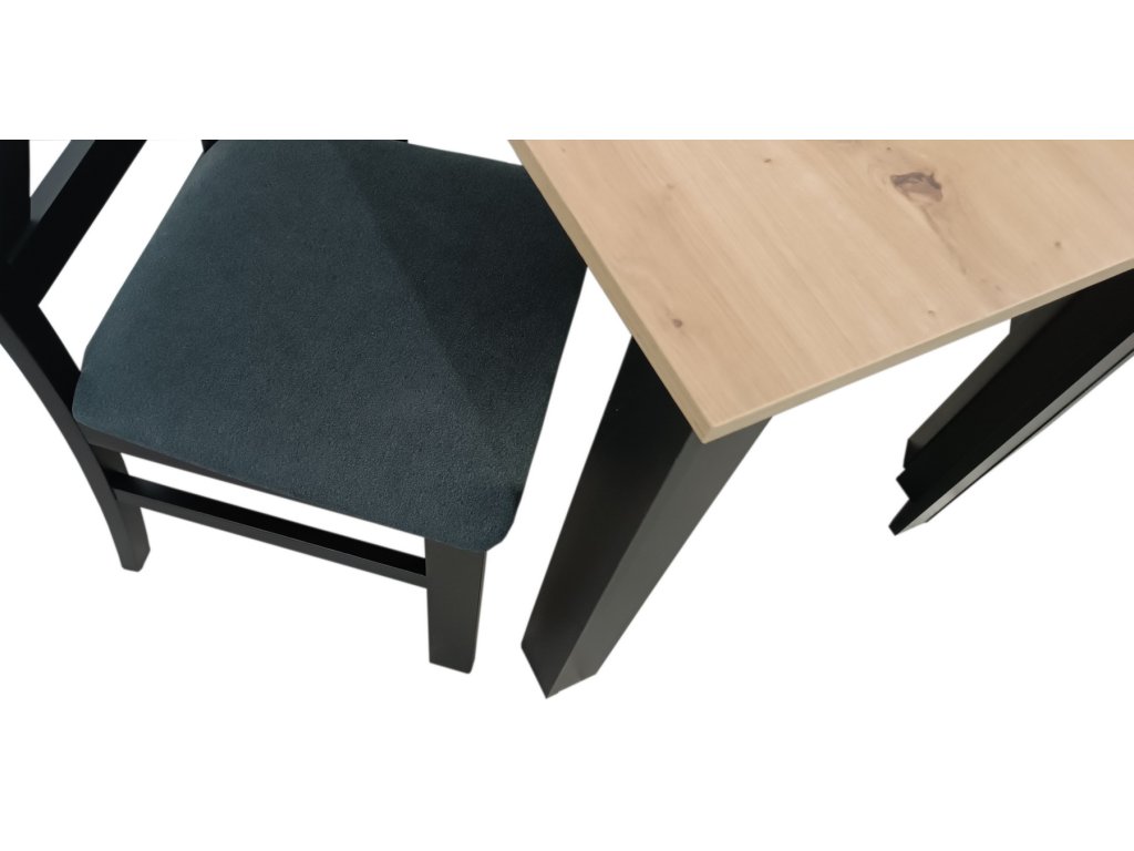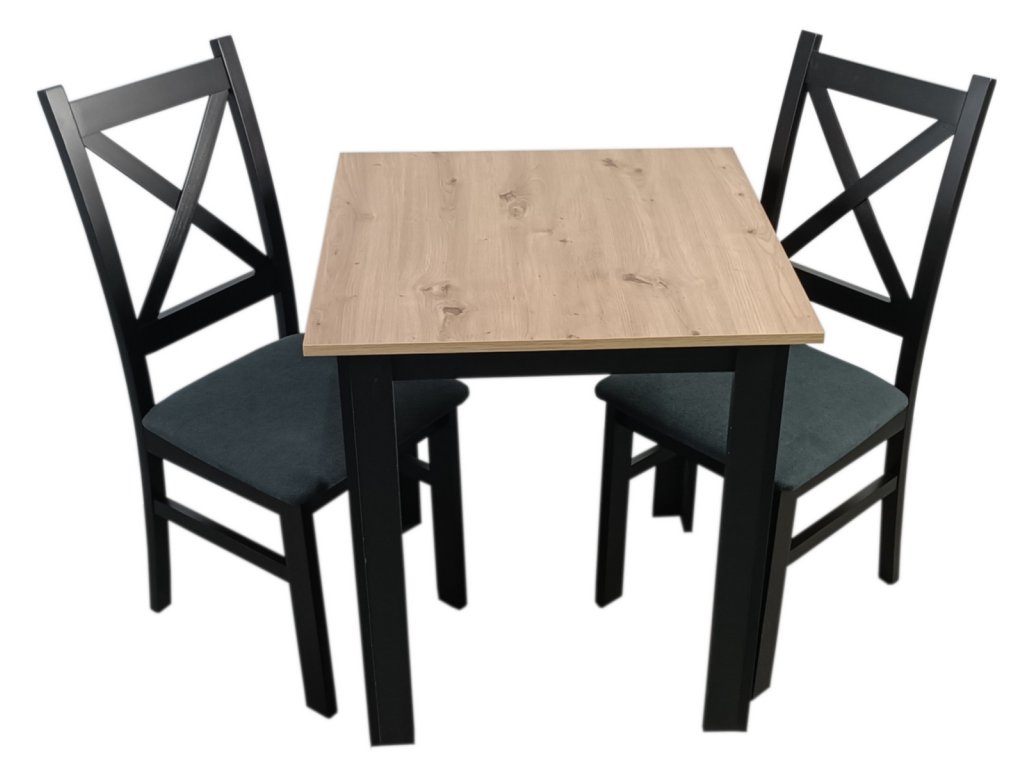 Jídelní sestava 1 stolu a 2 židlí. Deska jídelního stolu je vyrobena z LTD v barvě dub artisan, nohy stolu jsou z materiálu MDF a konstrukce židlí z bukového dřeva, obojí v barvě černá mat, vše hraněné ABS páskou. Židle má čalouněný sedák v látce Moric 8 (černá), výplň sedáku PUR pěna T30. Dodáváme v demontovaném stavu.Doplňkové parametry