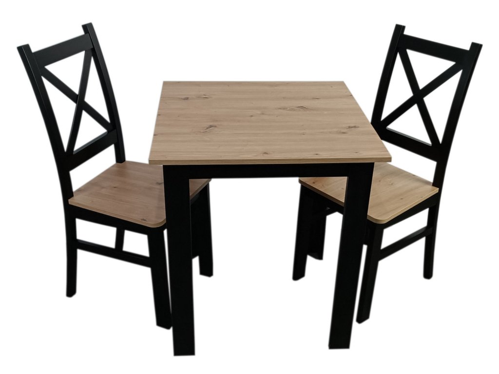 Jídelní sestava 1 stolu a 2 židlí. Deska jídelního stolu je vyrobena z LTD, sedák u židle z HDF, obojí jsou v barvě dub artisan, nohy stolu jsou z materiálu MDF a konstrukce židlí z bukového dřeva, obojí v barvě černá mat, vše hraněné ABS páskou. Dodáváme v demontovaném stavu.Doplňkové parametry