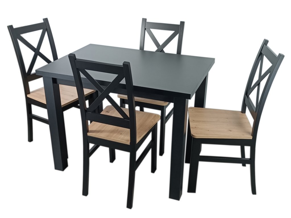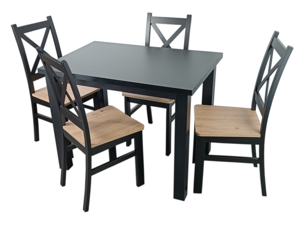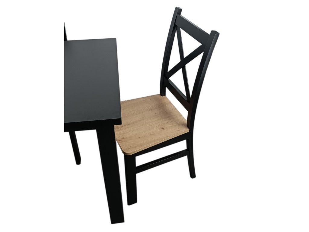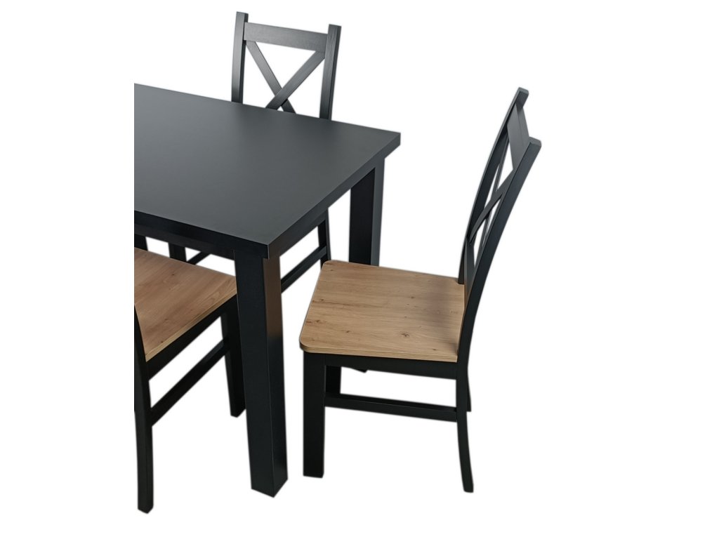 Jídelní sestava 1 stolu a 4 židlí. Deska jídelního stolu je vyrobena z LTD, nohy stolu jsou z materiálu MDF a konstrukce židlí z bukového dřeva, sedák z HDF, vše hraněné ABS páskou. Barva stolu je matná černá, židle je také černá mat se sedákem v barvě dub artisan. Jednotlivé díly lze zakoupit zvlášť. Dodáváme v demontovaném stavu.Doplňkové parametry