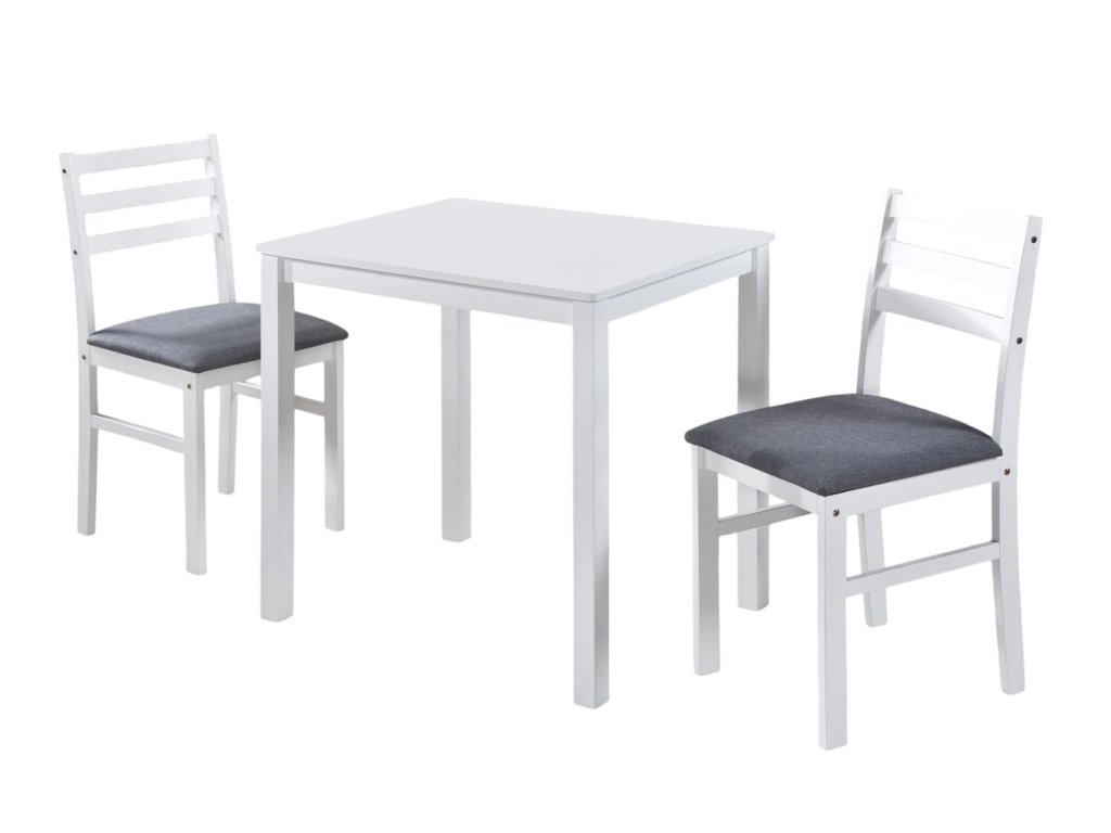 Elegantní jídelní set zútulní vaši kuchyni či jídelnu. Díky svým kompaktním rozměrům je ideální do malých prostorů. Najdete ho v příjemném bílém provedení. Sedák židle je v šedé barvě. Klasika, která dodá vašemu domovu pocit harmonie a naplní ho hřejivou atmosférou. Deska stolu je vyrobena z MDF desky dýhované přírodním dřevem. Sestava se skládá ze stolu a dvou židlí. Rozměry stolu: 80 × 60 × 74,5 cm. Rozměry židle: 40,5 × 49 × 84,5 cm. Dodávámee v dmontovaném stavu.Doplňkové parametry