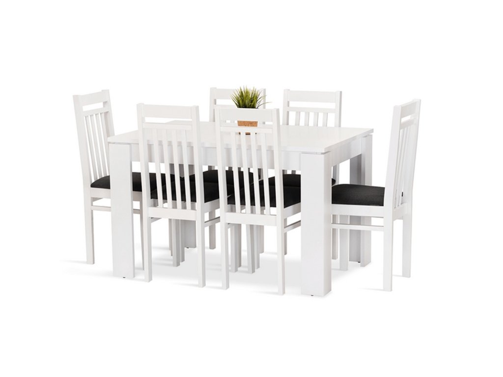 Jídelní sestava Dante 6 se skládá ze stolu a šesti židlí. Tato jídelní sestava splní svůj účel na výbornou nejen v kuchyni, ale i v jídelně, nebo obývacím pokoji s jídelním koutem. Svou vysokou kvalitou a precizním zpracováním, uspokojí všechny budoucí, i ty velmi náročné, uživatele. Stůl je vyrobený z bílého matného lamina tl.22 mm, kostry židlí z bukového dřeva, barveného na bílou barvu. Jídelní sestava je dodávaná v demontu. Součástí balení je schématický montážní návod, včetně všech potřebných spojovacích prvků. Cena je uvedena za jídelní stůl a 6 židlí.