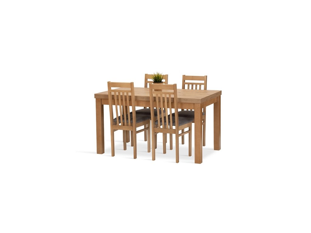 Jídelní sestava Meteor 4 se skládá z rozkládacího stolu a čtyř židlí. Tato jídelní sestava splní svůj účel na výbornou nejen v kuchyni, ale i v jídelně, nebo obývacím pokoji s jídelním koutem. Svou vysokou kvalitou a precizním zpracováním, uspokojí všechny budoucí, i ty velmi náročné, uživatele. Nohy stolu a kostry židlí jsou vyrobeny z bukového dřeva, mořeného tak, aby ladily s deskou stolu, která je vyrobená z lamina v dekoru dub artisan. Jídelní sestava je dodávaná v demontu. Součástí balení je schématický montážní návod, včetně všech potřebných spojovacích prvků. Cena je uvedena za jídelní stůl a 4 židle.