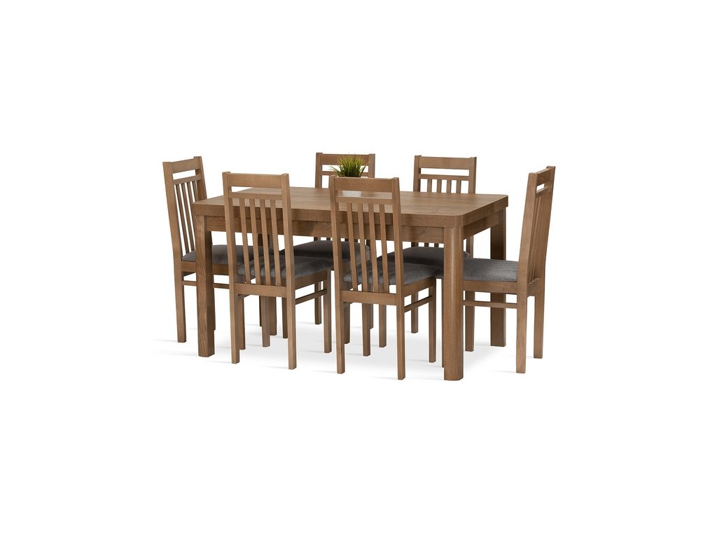 Jídelní sestava Meteor 6 se skládá z rozkládacího stolu a šesti židlí. Tato jídelní sestava splní svůj účel na výbornou nejen v kuchyni, ale i v jídelně, nebo obývacím pokoji s jídelním koutem. Svou vysokou kvalitou a precizním zpracováním, uspokojí všechny budoucí, i ty velmi náročné, uživatele. Nohy stolu a kostry židlí jsou vyrobeny z bukového dřeva, mořeného tak, aby ladily s deskou stolu, která je vyrobená z lamina v dekoru dub lefkas. Jídelní sestava je dodávaná v demontu. Součástí balení je schématický montážní návod, včetně všech potřebných spojovacích prvků. Cena je uvedena za jídelní stůl a 6 židlí. Úvodní fotografie je ilustrační. Židle budou dodány v zelené barvě.