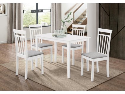 Elegantní jídelní set zútulní vaši kuchyni či jídelnu. Díky svým kompaktním rozměrům je ideální do malých prostorů. Najdete ho v příjemném bílém provedení. Sedák židle je v šedé...